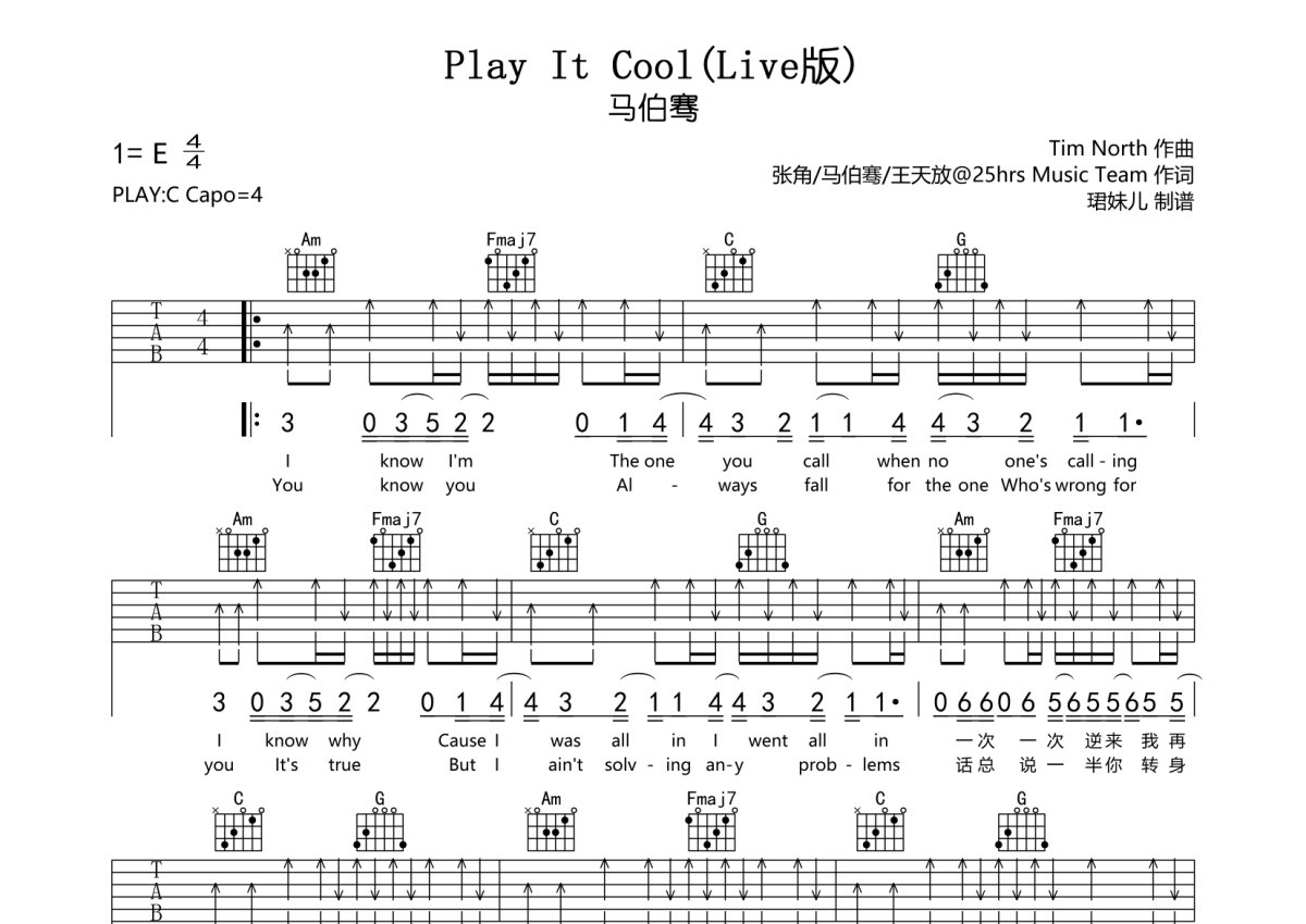 马伯骞《Play It Cool》吉他谱 - C调弹唱六线谱 - Live版