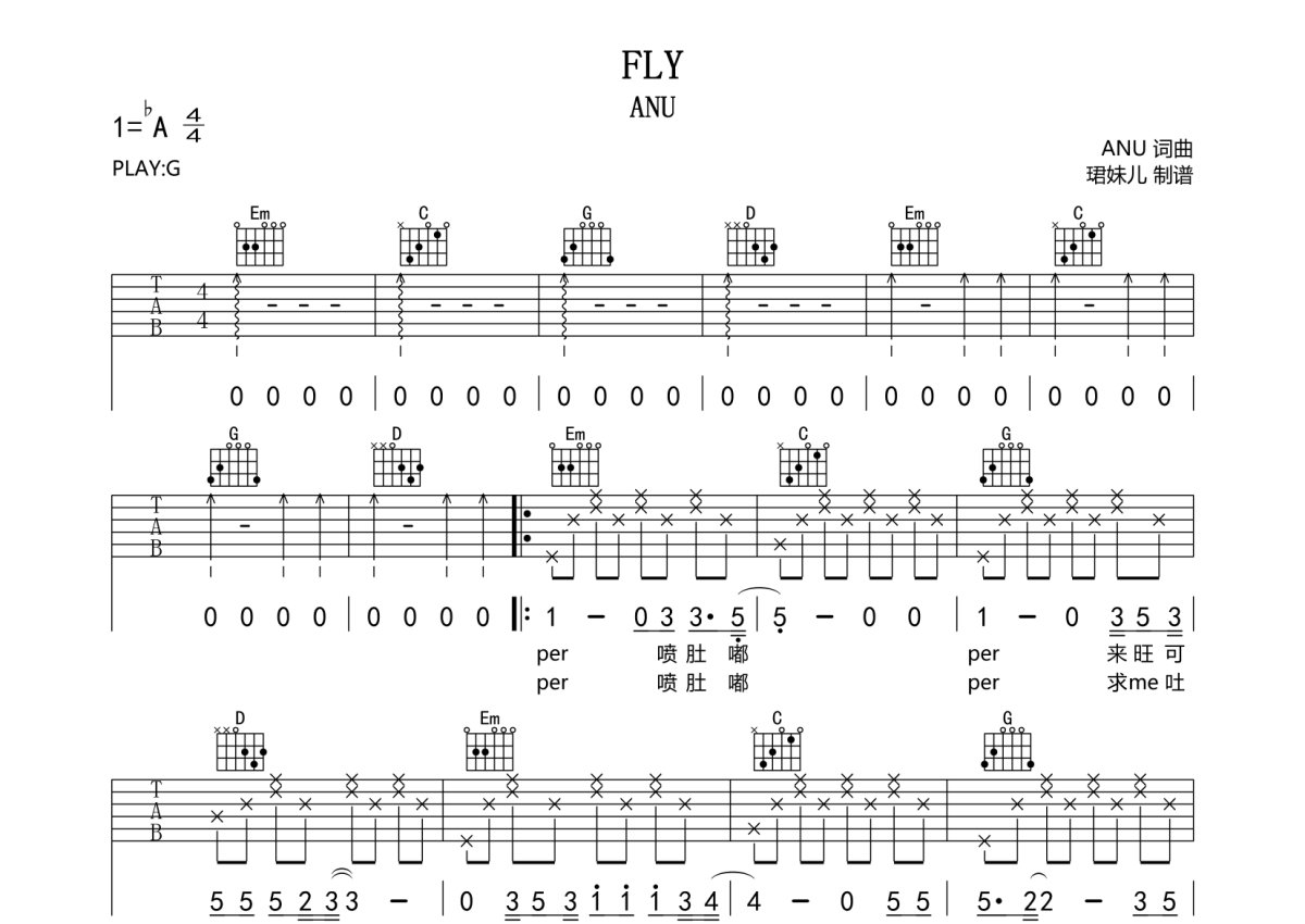 ANU《FLY》吉他谱 - G调弹唱六线谱