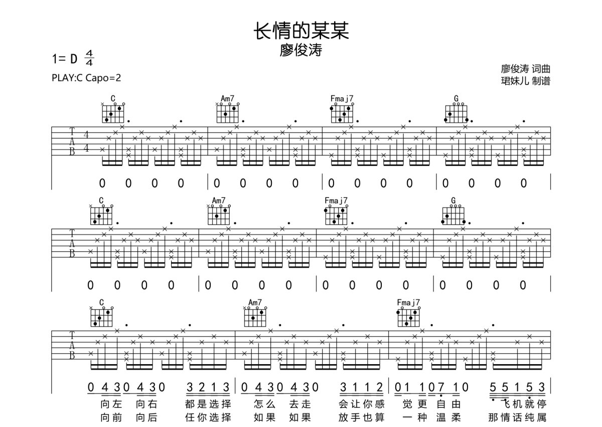廖俊涛《长情的某某》吉他谱 - D调弹唱六线谱