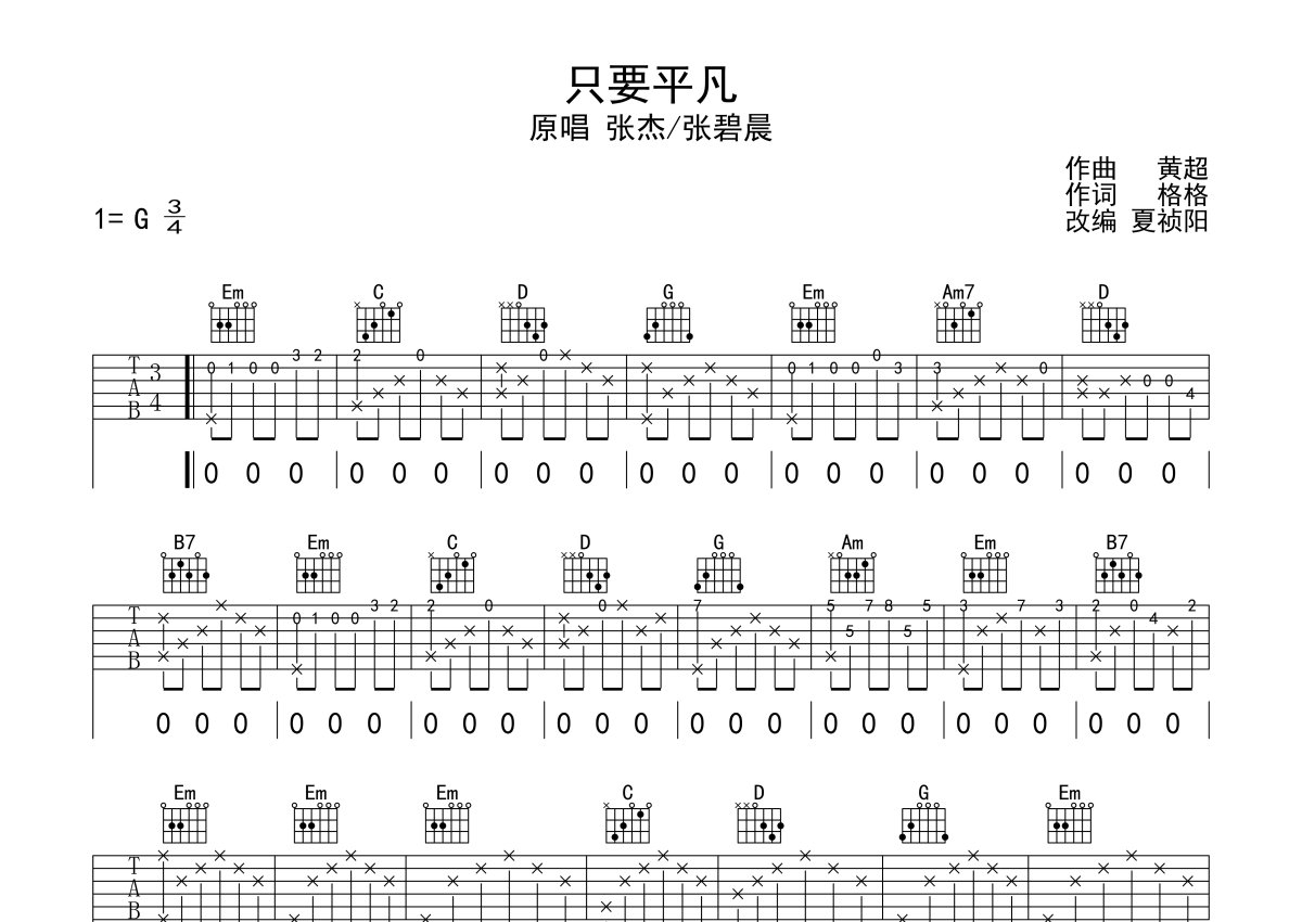 张杰/张碧晨《只要平凡》吉他谱 - G调弹唱六线谱
