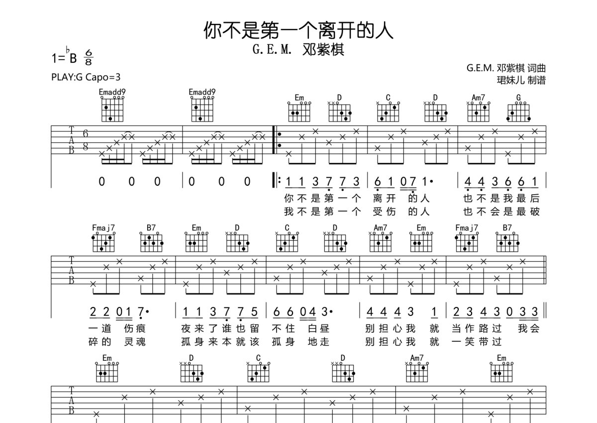 《你不是第一个离开的人》是G.E.M. 邓紫棋演唱的一首歌曲,本吉他谱采用的是G调指法编配,这份吉他谱共有两张高清图谱,图谱由 @珺妹儿 编配上传,图谱使用六线谱编配,包含吉他和弦指法、简谱以及歌词部分,使用这份你不是第一个离开的人吉他谱,可以让你更加方便地掌握这首歌曲的弹唱技巧,快来尝试吧。本谱采用G调指法编配,弹唱建议变调夹3品,速度85BPM难度较简单,易上手。