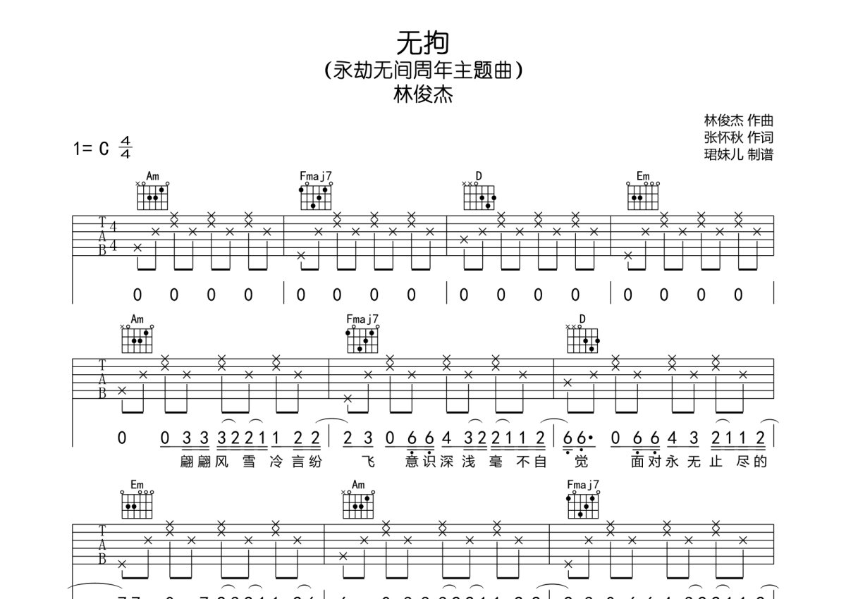 林俊杰《无拘》吉他谱 - C调弹唱六线谱