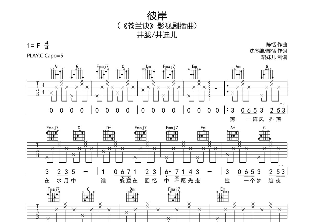 《彼岸》是井胧/井迪儿演唱的一首歌曲,本吉他谱采用的是C调指法编配,这份吉他谱共有两张高清图谱,图谱由 @珺妹儿 编配上传,图谱使用六线谱编配,包含吉他和弦指法、简谱以及歌词部分,使用这份彼岸吉他谱,可以让你更加方便地掌握这首歌曲的弹唱技巧,快来尝试吧。(《苍兰诀》影视剧插曲) , 本谱采用C调指法编配,,弹唱建议变调夹5品,速度85BPM难度较简单,易上手。