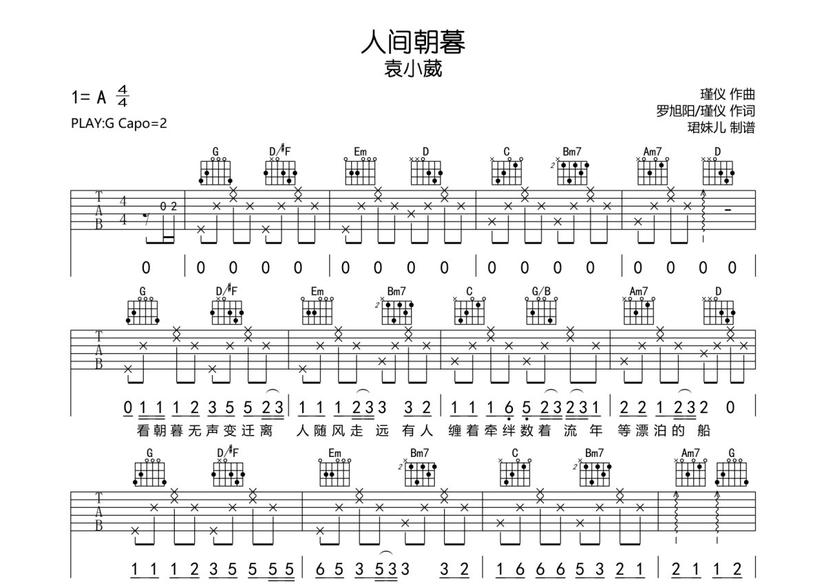 《人间朝暮》是袁小葳演唱的一首歌曲,本吉他谱采用的是G调指法编配,这份吉他谱共有两张高清图谱,图谱由 @珺妹儿 编配上传,图谱使用六线谱编配,包含吉他和弦指法、简谱以及歌词部分,使用这份人间朝暮吉他谱,可以让你更加方便地掌握这首歌曲的弹唱技巧,快来尝试吧。本谱采用G调指法编配,,弹唱建议变调夹2品,速度85BPM难度较简单,易上手。