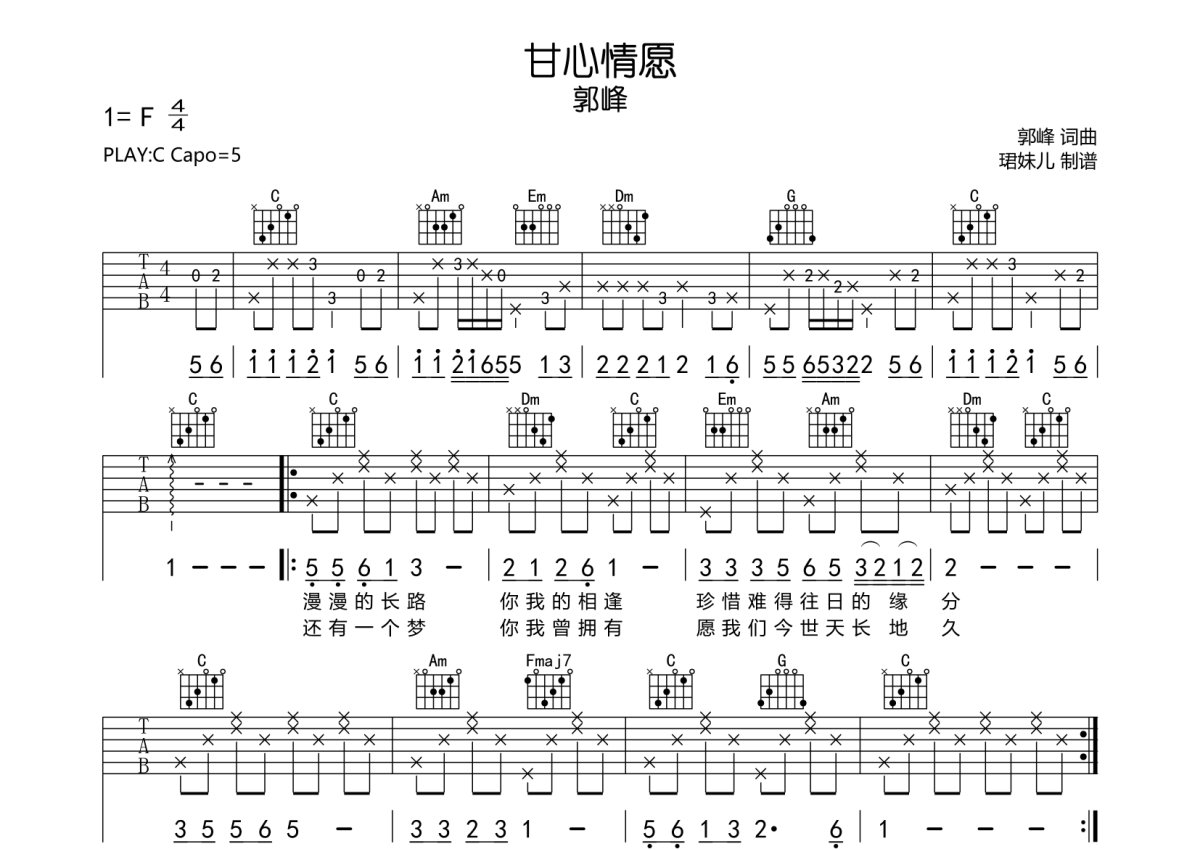 郭峰《甘心情愿》吉他谱 - C调弹唱六线谱