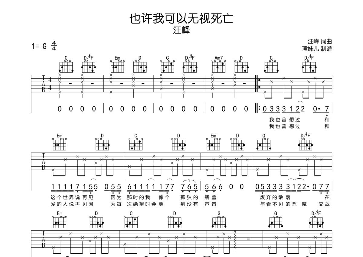 汪峰《也许我可以无视死亡》吉他谱 - G调弹唱六线谱