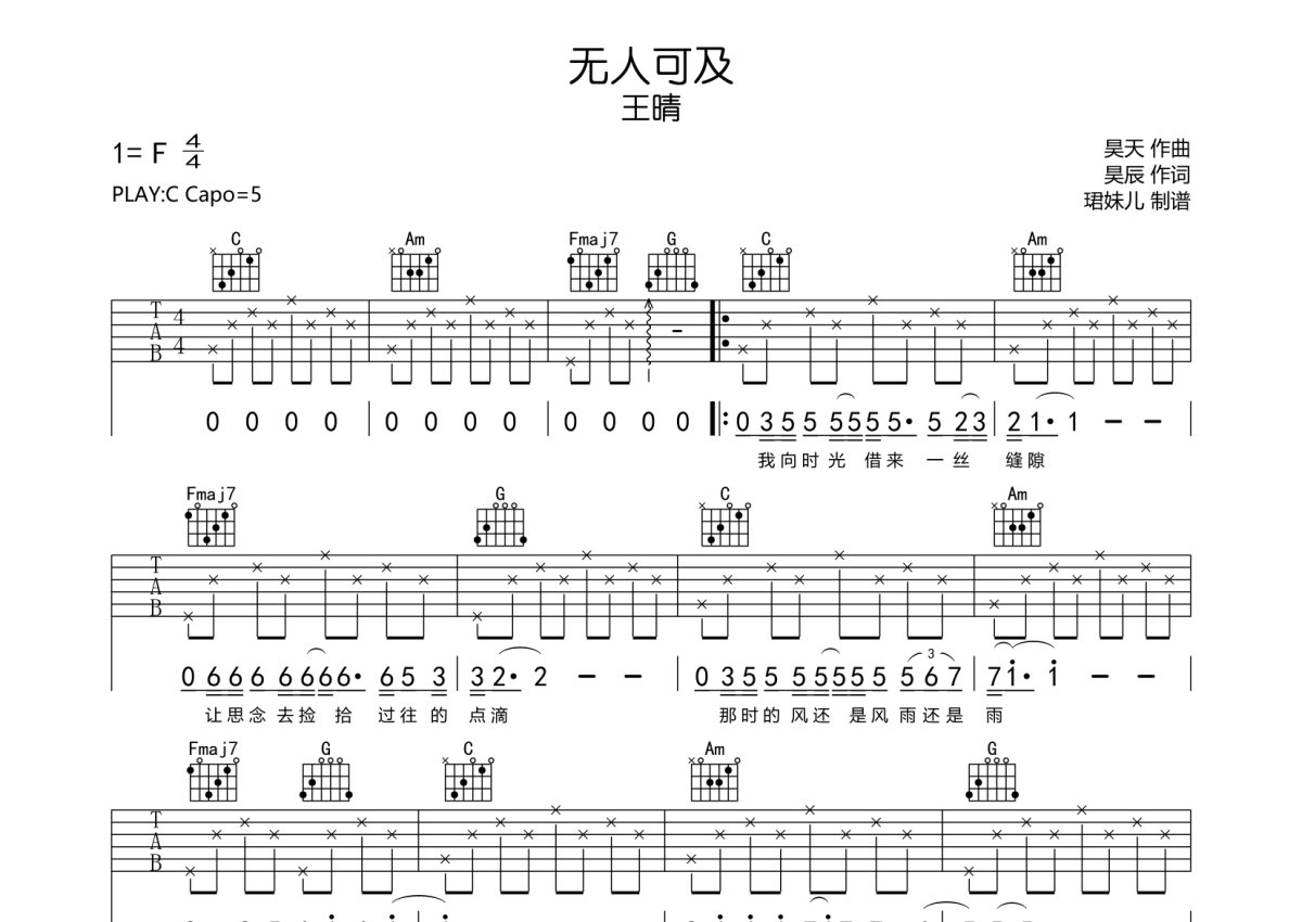 王晴《无人可及》吉他谱 - C调弹唱六线谱