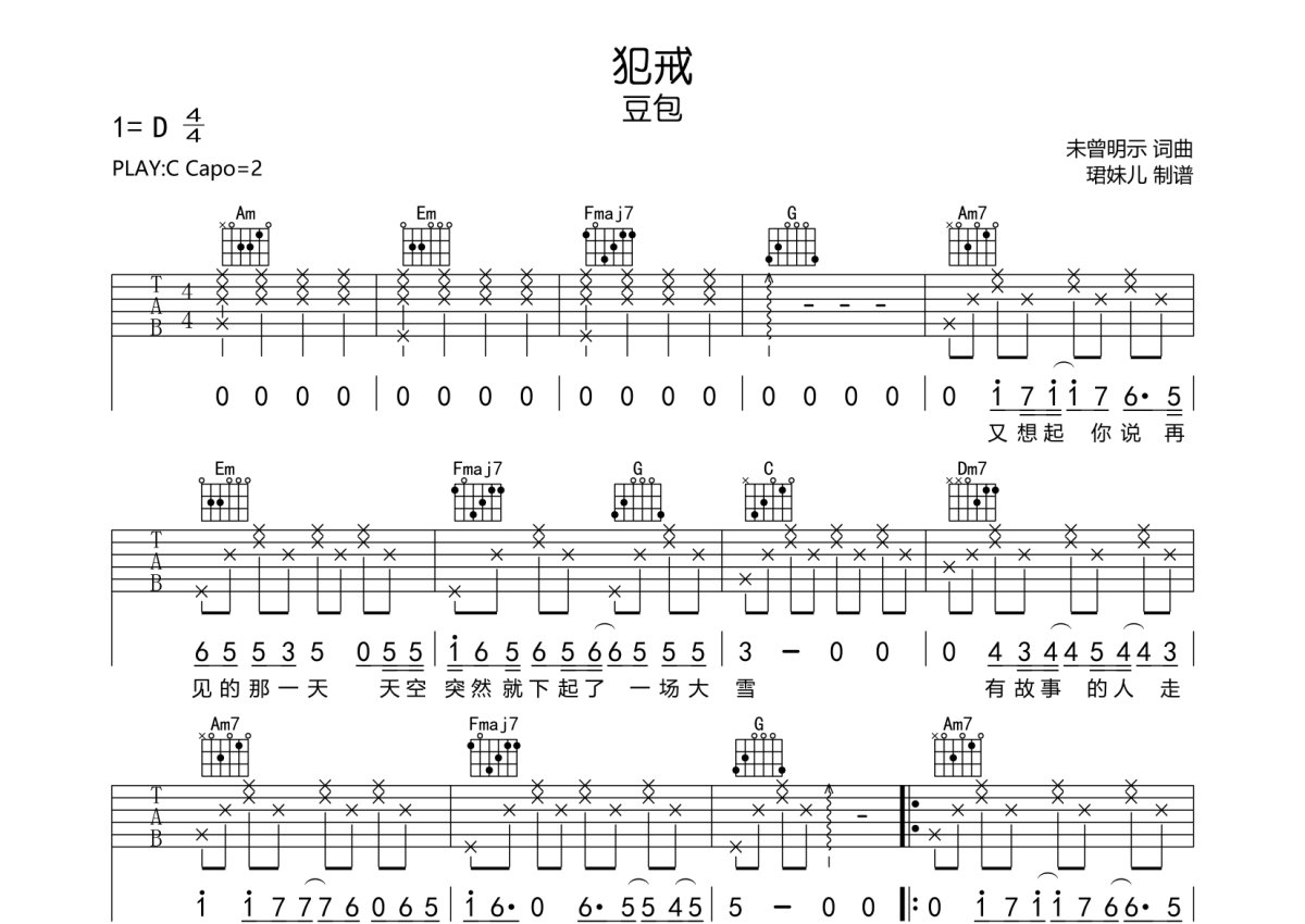 豆包《犯戒》吉他谱 - C调弹唱六线谱