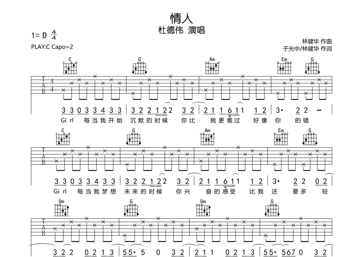 杜德伟《情人》吉他谱 - C调弹唱六线谱