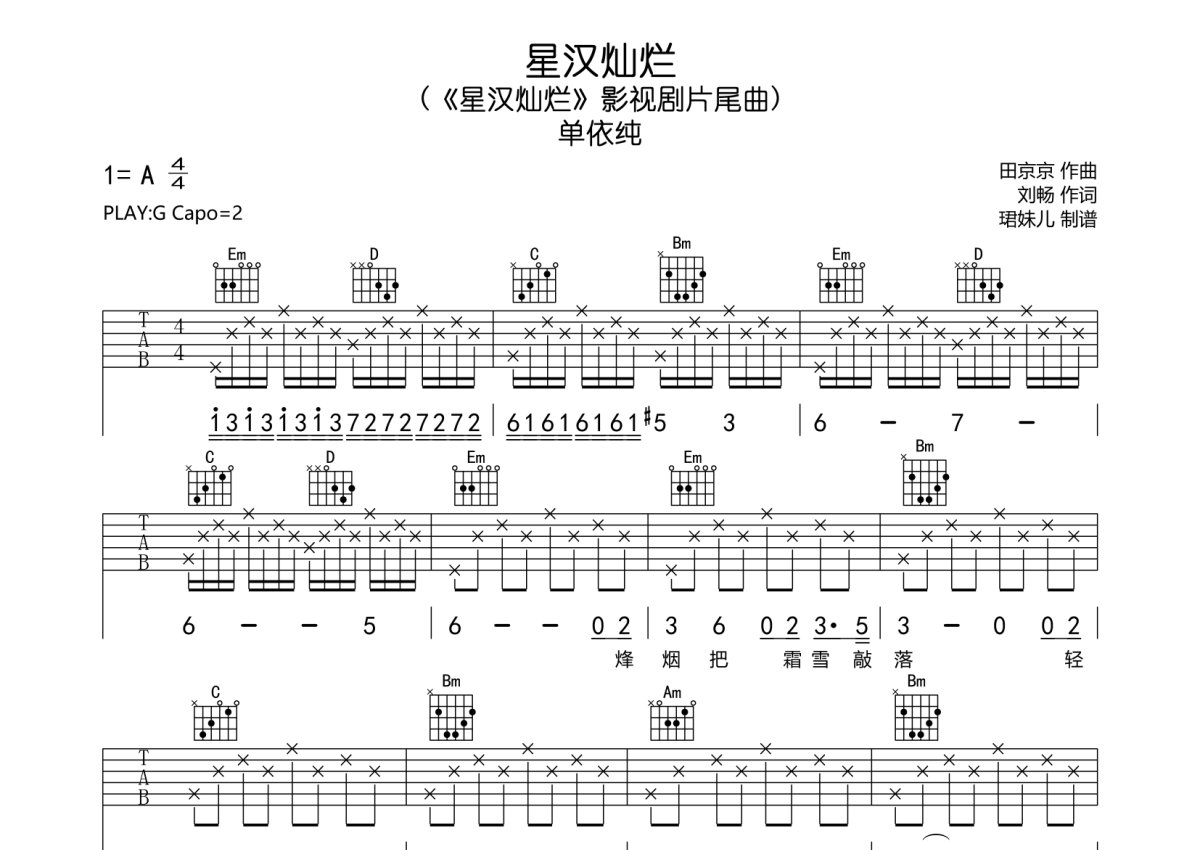 《星汉灿烂》是单依纯演唱的一首歌曲,本吉他谱采用的是G调指法编配,这份吉他谱共有两张高清图谱,图谱由 @珺妹儿 编配上传,图谱使用六线谱编配,包含吉他和弦指法、简谱以及歌词部分,使用这份星汉灿烂吉他谱,可以让你更加方便地掌握这首歌曲的弹唱技巧,快来尝试吧。《星汉灿烂》影视剧主题曲/片尾曲,本谱采用G调指法编配,弹唱建议变调夹2品,速度85BPM难度较简单,易上手。