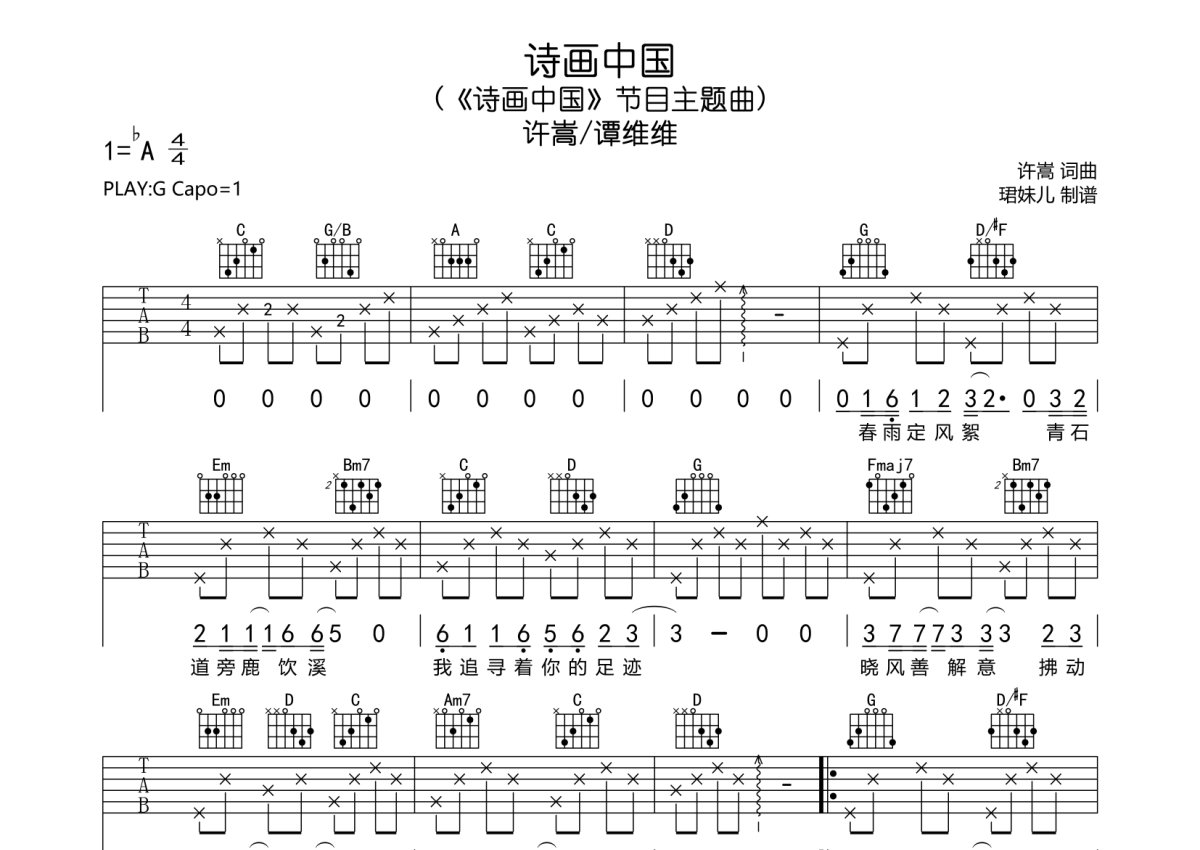 《诗画中国》是许嵩/谭维维演唱的一首歌曲,本吉他谱采用的是G调指法编配,这份吉他谱共有三张高清图谱,图谱由 @珺妹儿 编配上传,图谱使用六线谱编配,包含吉他和弦指法、简谱以及歌词部分,使用这份诗画中国吉他谱,可以让你更加方便地掌握这首歌曲的弹唱技巧,快来尝试吧。《诗画中国》节目主题曲,本谱采用G调指法编配,弹唱建议变调夹1品,速度85BPM难度较简单,易上手。