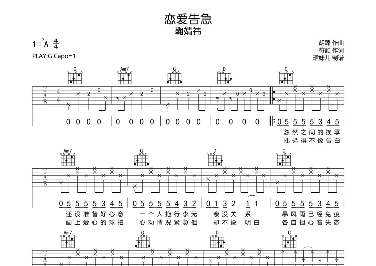 《恋爱告急》是鞠婧祎演唱的一首歌曲,本吉他谱采用的是G调指法编配,这份吉他谱共有三张高清图谱,图谱由 @珺妹儿 编配上传,图谱使用六线谱编配,包含吉他和弦指法、简谱以及歌词部分,使用这份恋爱告急吉他谱,可以让你更加方便地掌握这首歌曲的弹唱技巧,快来尝试吧。本谱采用G调指法编配,弹唱建议变调夹1品,速度85BPM难度较简单,易上手。