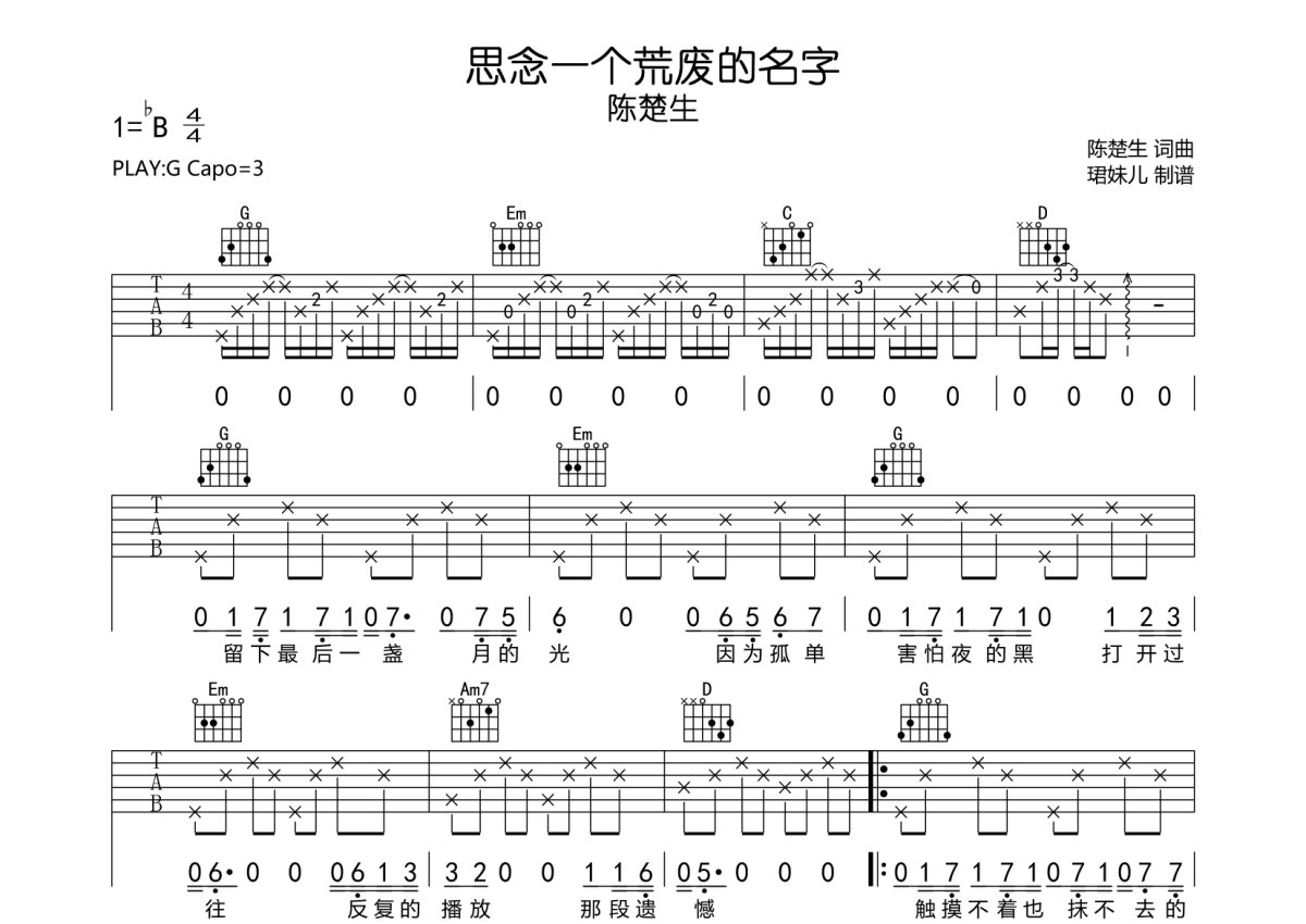 《思念一个荒废的名字》是陈楚生演唱的一首歌曲,本吉他谱采用的是G调指法编配,这份吉他谱共有两张高清图谱,图谱由 @珺妹儿 编配上传,图谱使用六线谱编配,包含吉他和弦指法、简谱以及歌词部分,使用这份思念一个荒废的名字吉他谱,可以让你更加方便地掌握这首歌曲的弹唱技巧,快来尝试吧。本谱采用G调指法编配,弹唱建议变调夹3品,速度75BPM难度较简单,易上手。