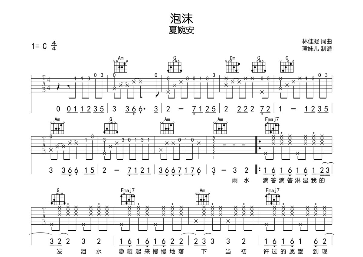 夏婉安《泡沫》吉他谱 - C调弹唱六线谱