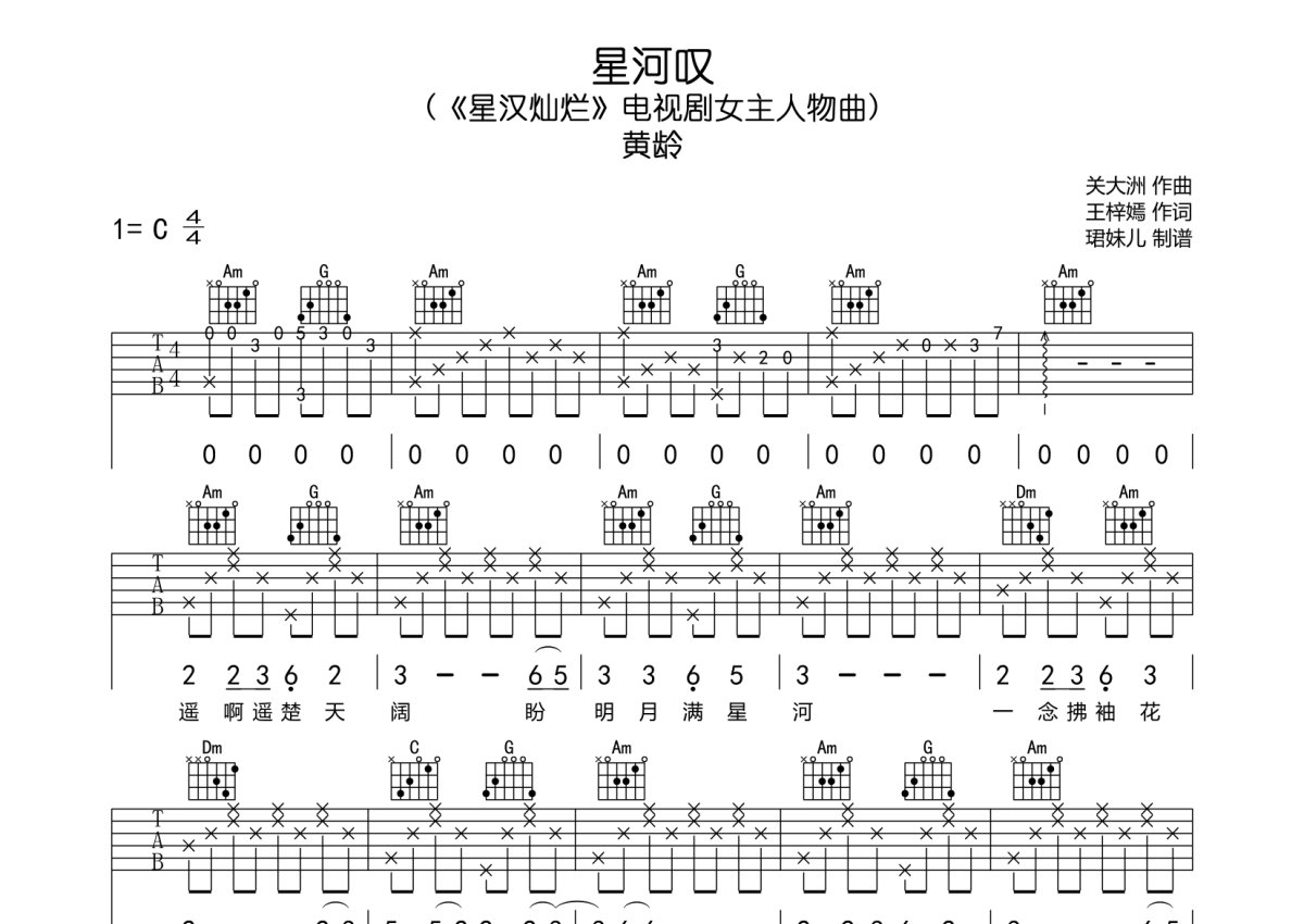 黄龄《星河叹》吉他谱 - C调弹唱六线谱