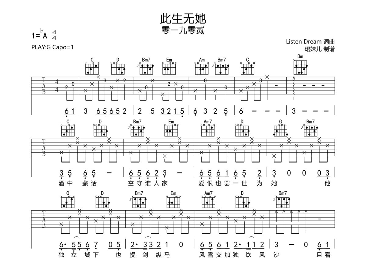 零一九零贰《此生无她》吉他谱 - G调弹唱六线谱