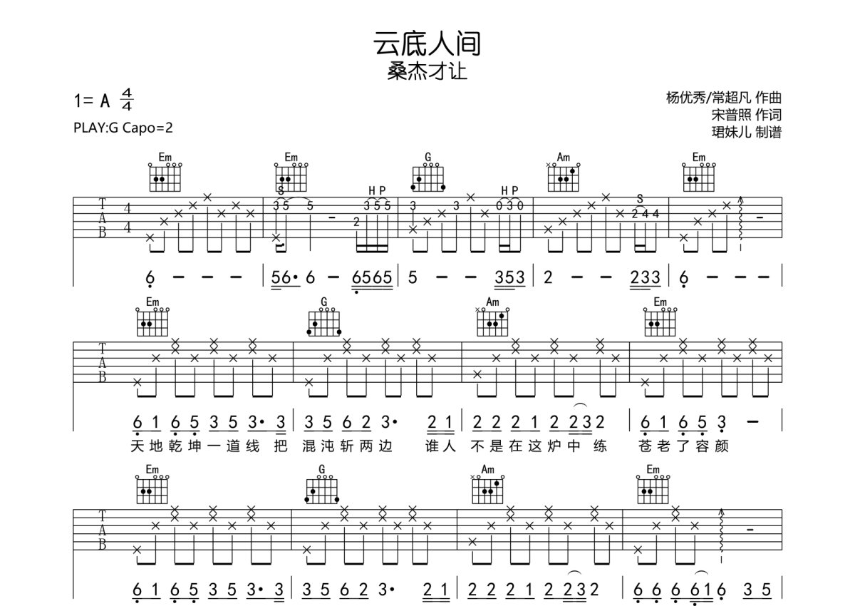 桑杰才让《云底人间》吉他谱 - G调弹唱六线谱