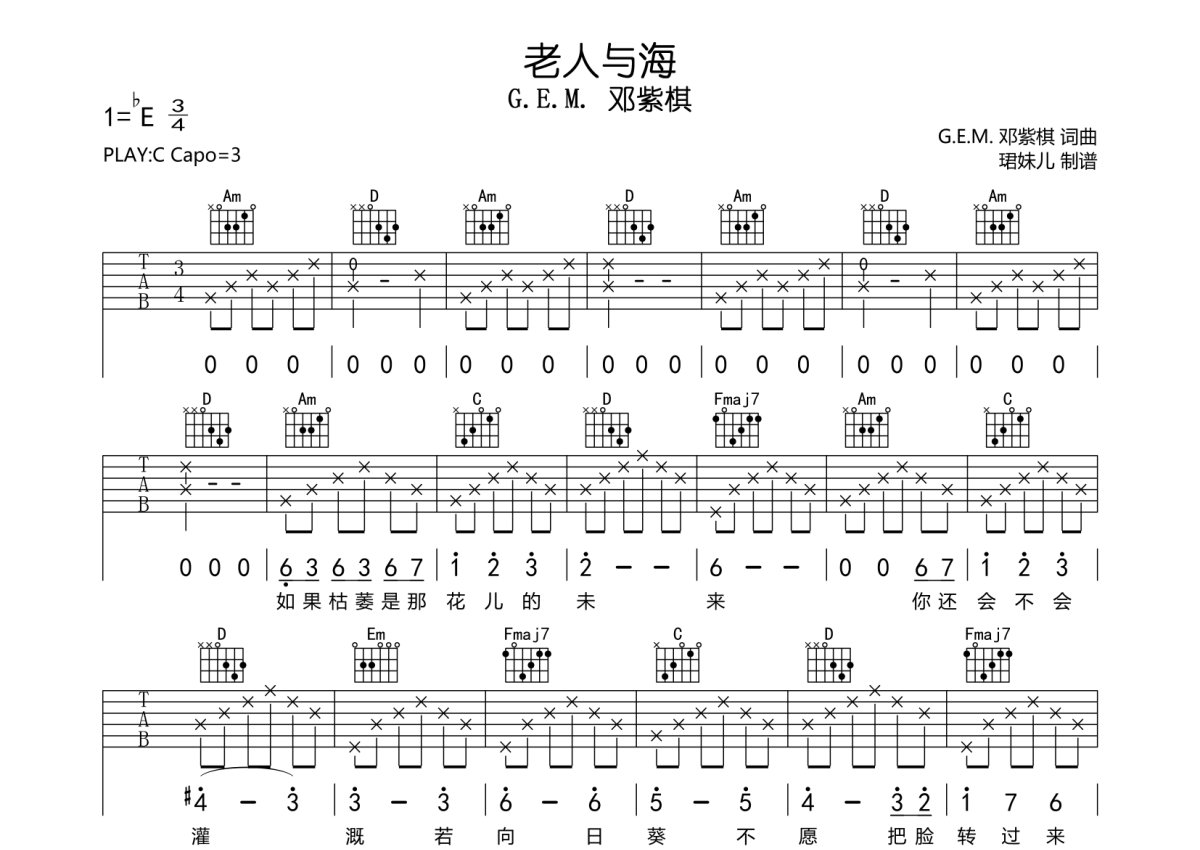 G.E.M. 邓紫棋《老人与海》吉他谱 - C调弹唱六线谱