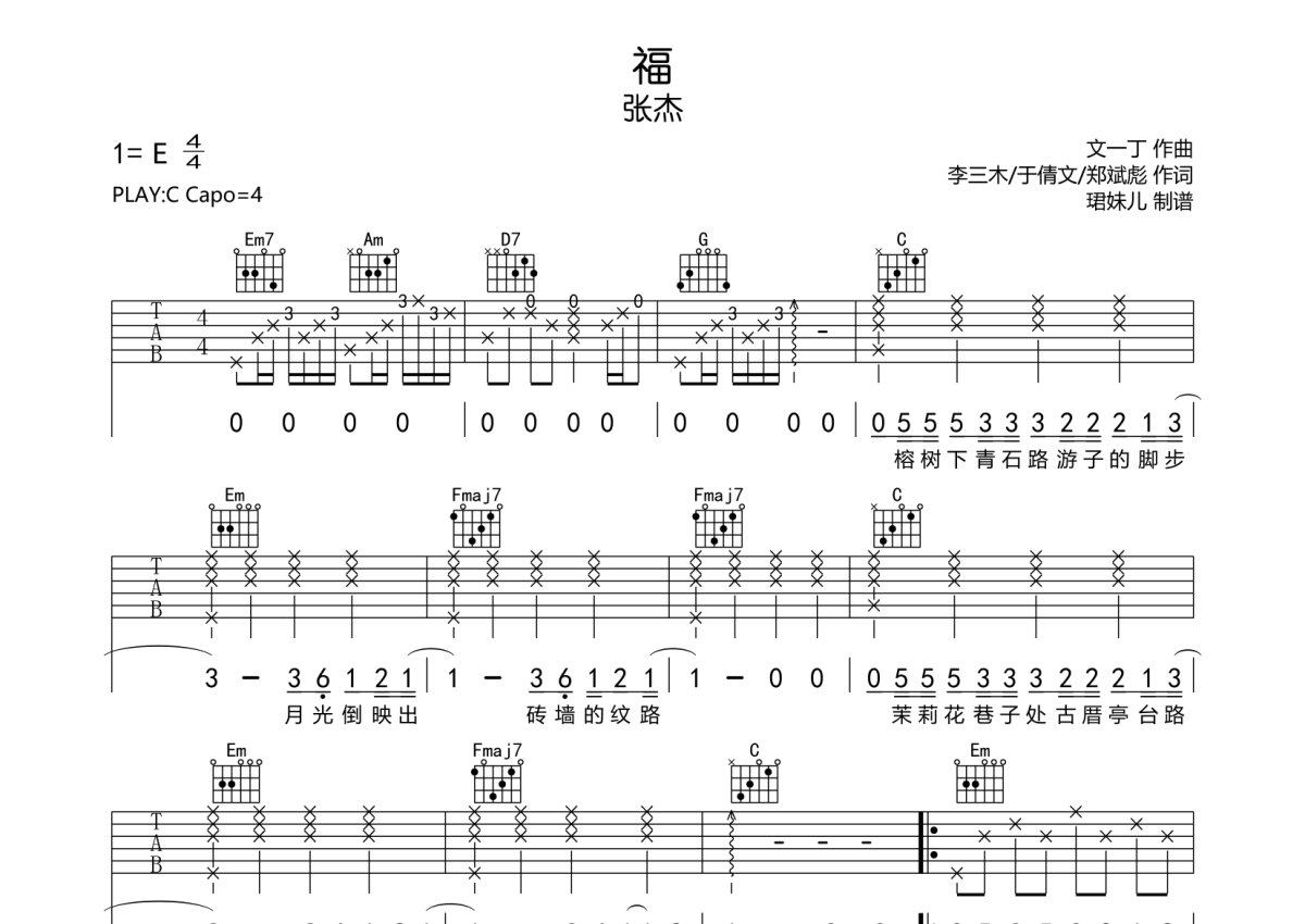 《福》是张杰演唱的一首歌曲,本吉他谱采用的是C调指法编配,这份吉他谱共有两张高清图谱,图谱由 @珺妹儿 编配上传,图谱使用六线谱编配,包含吉他和弦指法、简谱以及歌词部分,使用这份福吉他谱,可以让你更加方便地掌握这首歌曲的弹唱技巧,快来尝试吧。本谱采用C调指法编配,弹唱建议变调夹4品,速度75BPM难度较简单,易上手。