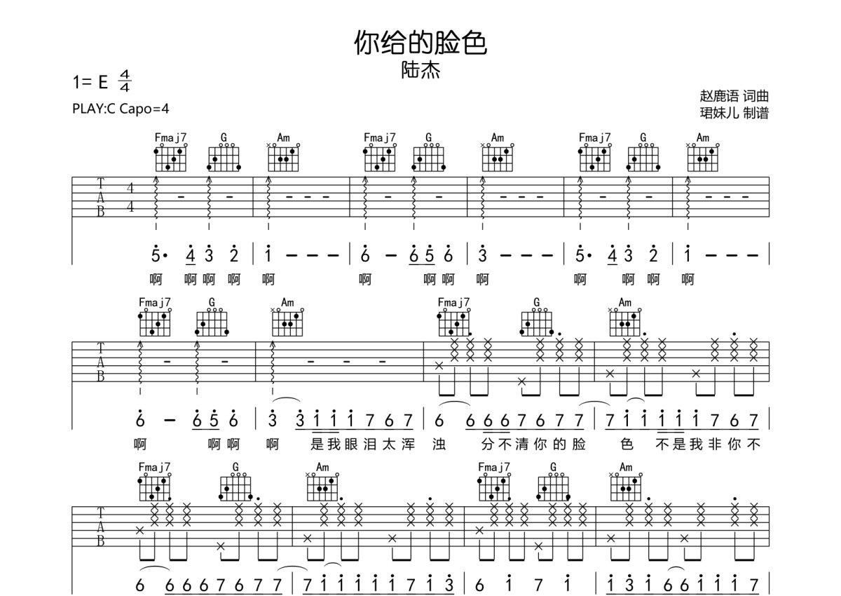 陆杰awr《你给的脸色》吉他谱 - C调弹唱六线谱