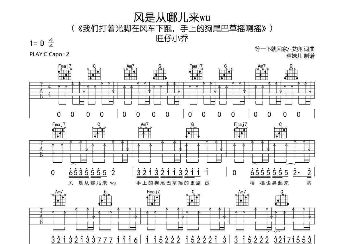 《风是从哪儿来wu》是旺仔小乔演唱的一首歌曲,本吉他谱采用的是C调指法编配,这份吉他谱共有两张高清图谱,图谱由 @珺妹儿 编配上传,图谱使用六线谱编配,包含吉他和弦指法、简谱以及歌词部分,使用这份风是从哪儿来wu吉他谱,可以让你更加方便地掌握这首歌曲的弹唱技巧,快来尝试吧。《我们打着光脚在风车下跑,手上的狗尾巴草摇啊摇》,本谱采用C调指法编配,弹唱建议变调夹2品,度95BPM难度较简单,易上手。