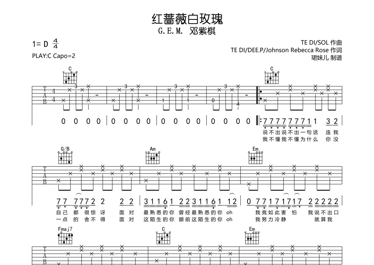 《红蔷薇白玫瑰》是G.E.M. 邓紫棋演唱的一首歌曲,本吉他谱采用的是C调指法编配,这份吉他谱共有两张高清图谱,图谱由 @珺妹儿 编配上传,图谱使用六线谱编配,包含吉他和弦指法、简谱以及歌词部分,使用这份红蔷薇白玫瑰吉他谱,可以让你更加方便地掌握这首歌曲的弹唱技巧,快来尝试吧。本谱采用C调指法编配,弹唱建议变调夹2品,度85BPM难度较简单,易上手。