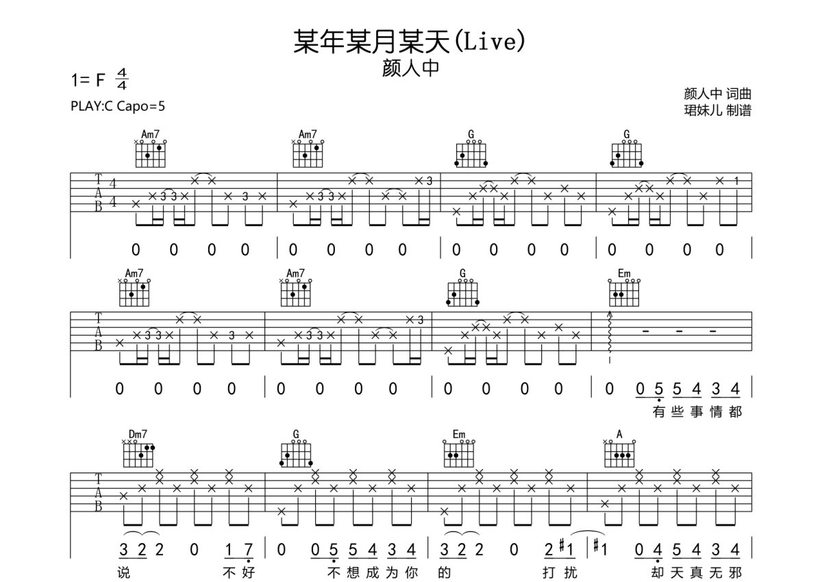 颜人中《某年某月某天(Live)》吉他谱 - C调弹唱六线谱