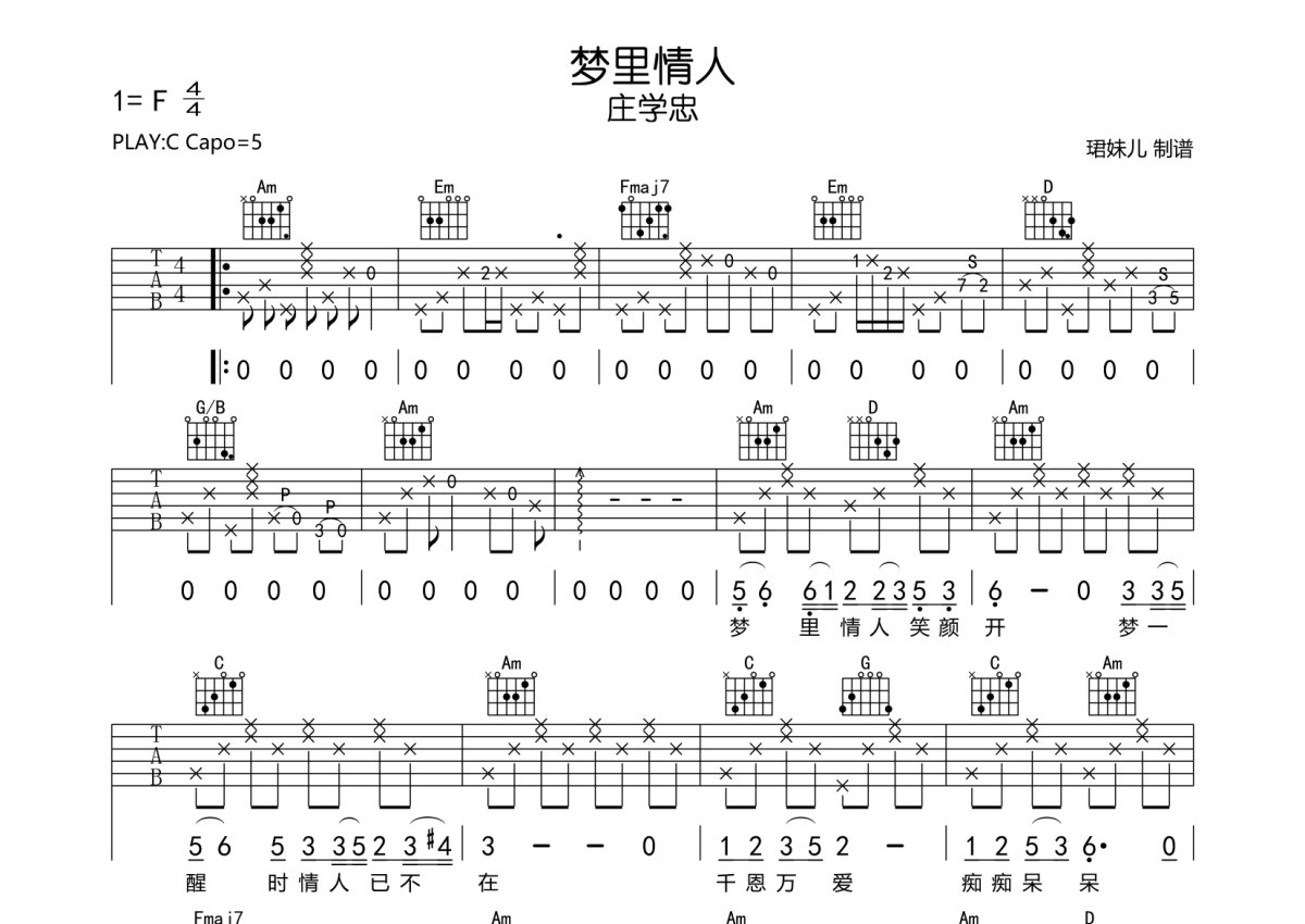 庄学忠《梦里情人》吉他谱 - C调弹唱六线谱