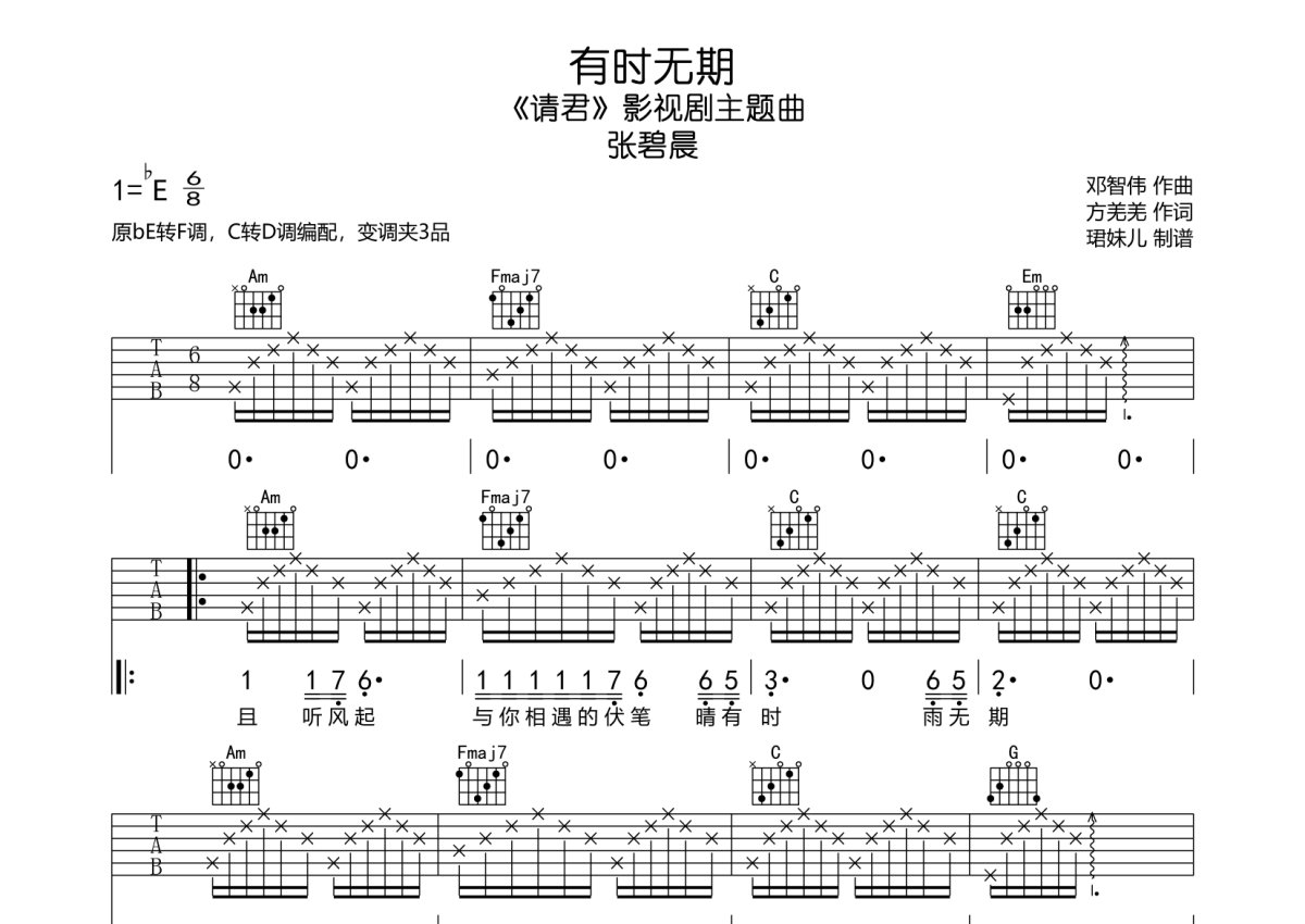 《有时无期》是张碧晨演唱的一首歌曲,本吉他谱采用的是C调指法编配,这份吉他谱共有两张高清图谱,图谱由 @珺妹儿 编配上传,图谱使用六线谱编配,包含吉他和弦指法、简谱以及歌词部分,使用这份有时无期吉他谱,可以让你更加方便地掌握这首歌曲的弹唱技巧,快来尝试吧。《请君》影视剧主题曲,本谱采用C转D调指法编配,变调夹3品,速度85BPM难度较简单,易上手。