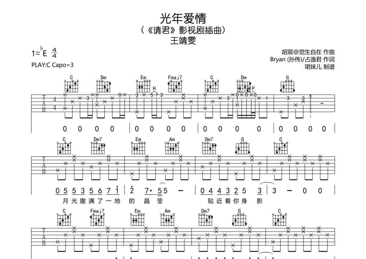 王靖雯《光年爱情》吉他谱 - C调弹唱六线谱