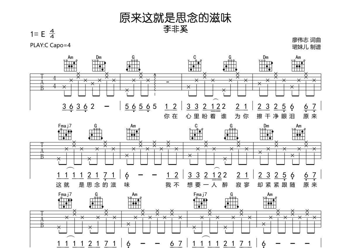 李非奚《原来这就是思念的滋味》吉他谱 - C调弹唱六线谱