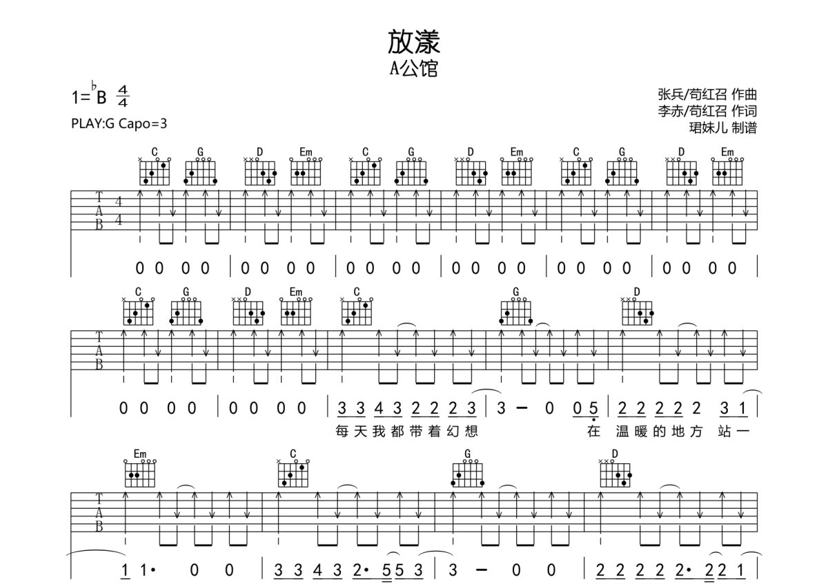 《放漾》是A公馆演唱的一首歌曲,本吉他谱采用的是G调指法编配,这份吉他谱共有三张高清图谱,图谱由 @珺妹儿 编配上传,图谱使用六线谱编配,包含吉他和弦指法、简谱以及歌词部分,使用这份放漾吉他谱,可以让你更加方便地掌握这首歌曲的弹唱技巧,快来尝试吧。本谱采用G调指法编配,弹唱建议变调夹3品,速度85BPM难度较简单,易上手。