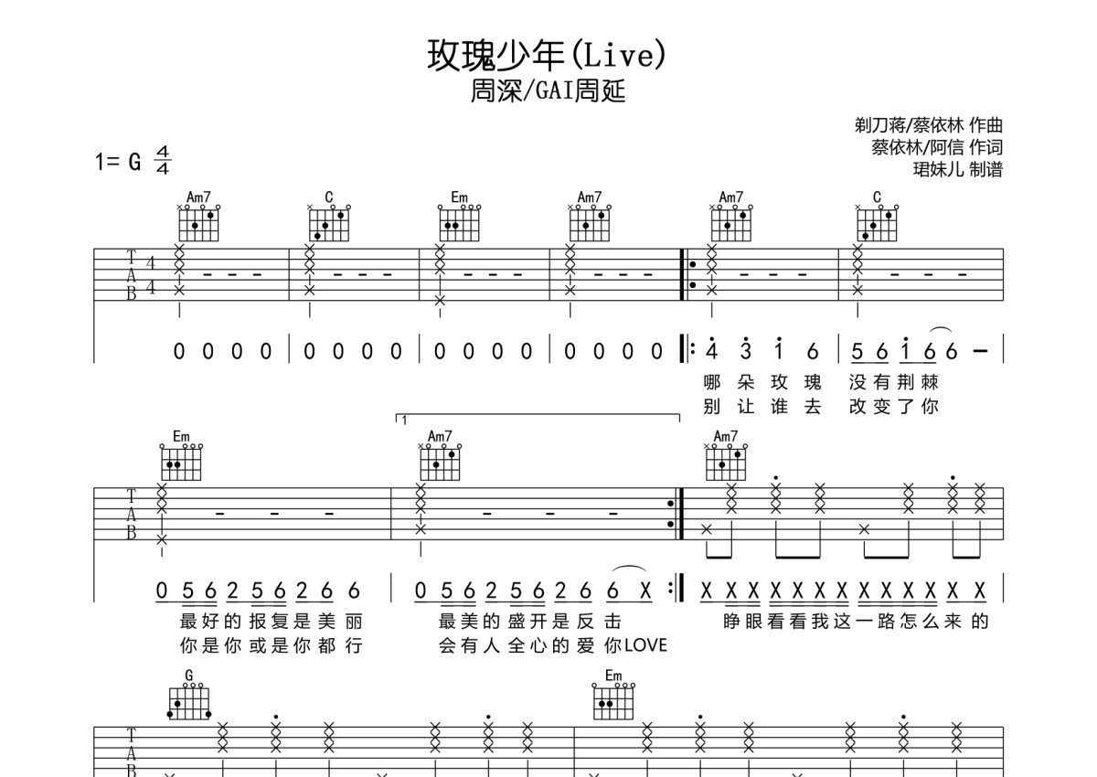 周深/GAI周延《玫瑰少年(Live)》吉他谱 - G调弹唱六线谱