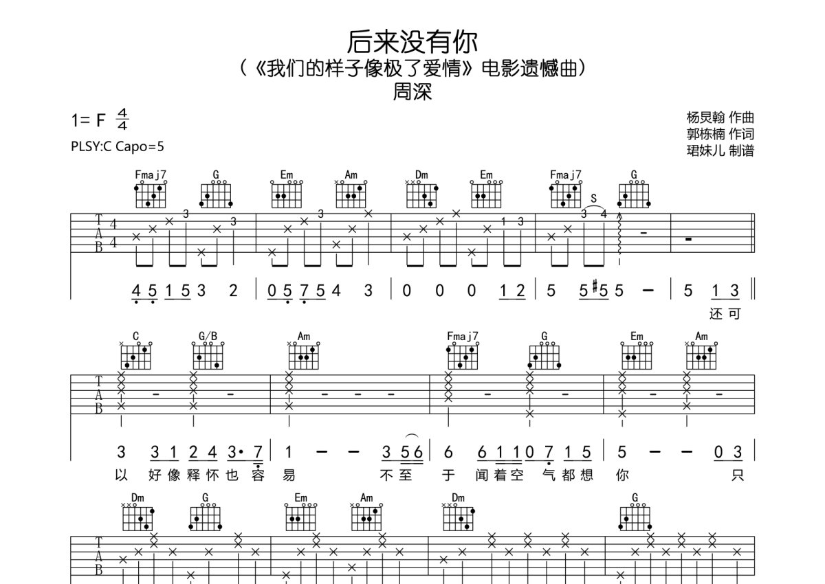 《后来没有你》是周深演唱的一首歌曲,本吉他谱采用的是C调指法编配,这份吉他谱共有两张高清图谱,图谱由 @珺妹儿 编配上传,图谱使用六线谱编配,包含吉他和弦指法、简谱以及歌词部分,使用这份后来没有你吉他谱,可以让你更加方便地掌握这首歌曲的弹唱技巧,快来尝试吧。(《我们的样子像极了爱情》电影遗憾曲),本谱采用C调指法编配,弹唱建议变调夹5品,速度85BPM难度较简单,易上手。
