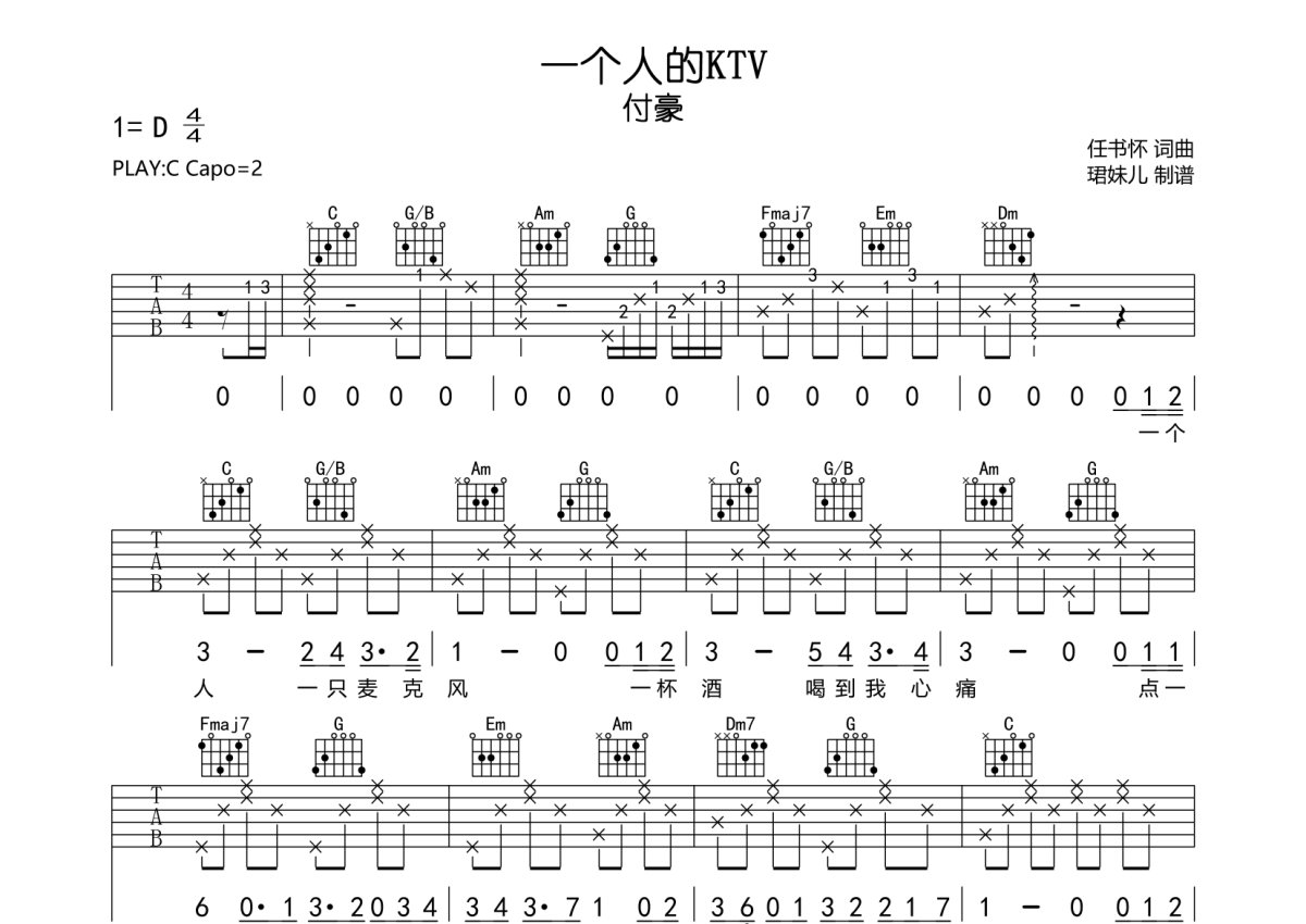 付豪《一个人的KTV》吉他谱 - C调弹唱六线谱