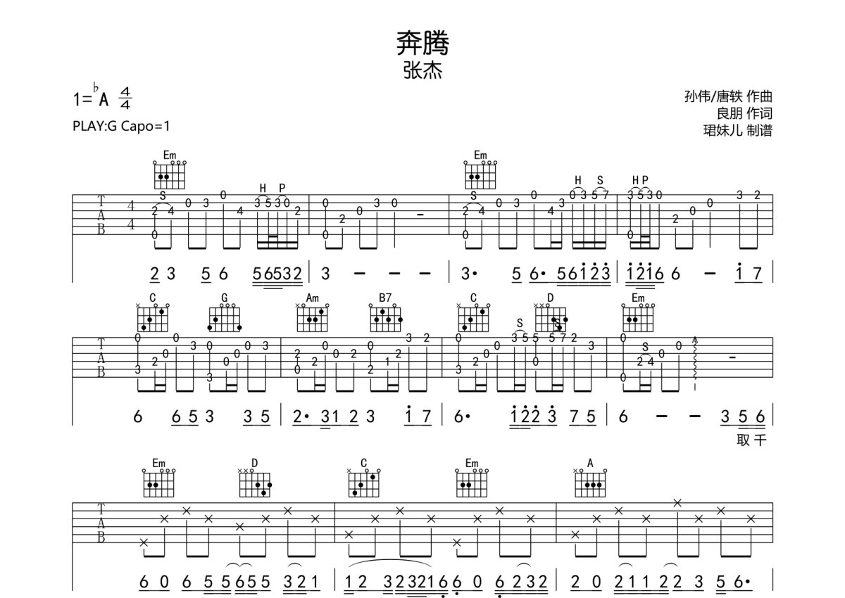 《奔腾》是张杰演唱的一首歌曲,本吉他谱采用的是G调指法编配,这份吉他谱共有两张高清图谱,图谱由 @珺妹儿 编配上传,图谱使用六线谱编配,包含吉他和弦指法、简谱以及歌词部分,使用这份奔腾吉他谱,可以让你更加方便地掌握这首歌曲的弹唱技巧,快来尝试吧。本谱采用G调指法编配,弹唱建议变调夹1品,速度85BPM难度较简单,易上手。
