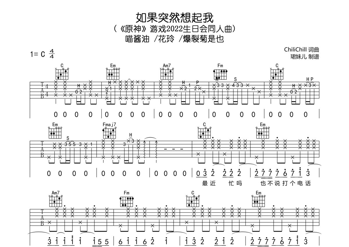 喵酱油/花玲/爆裂菊是也《如果突然想起我》吉他谱 - C调弹唱六线谱