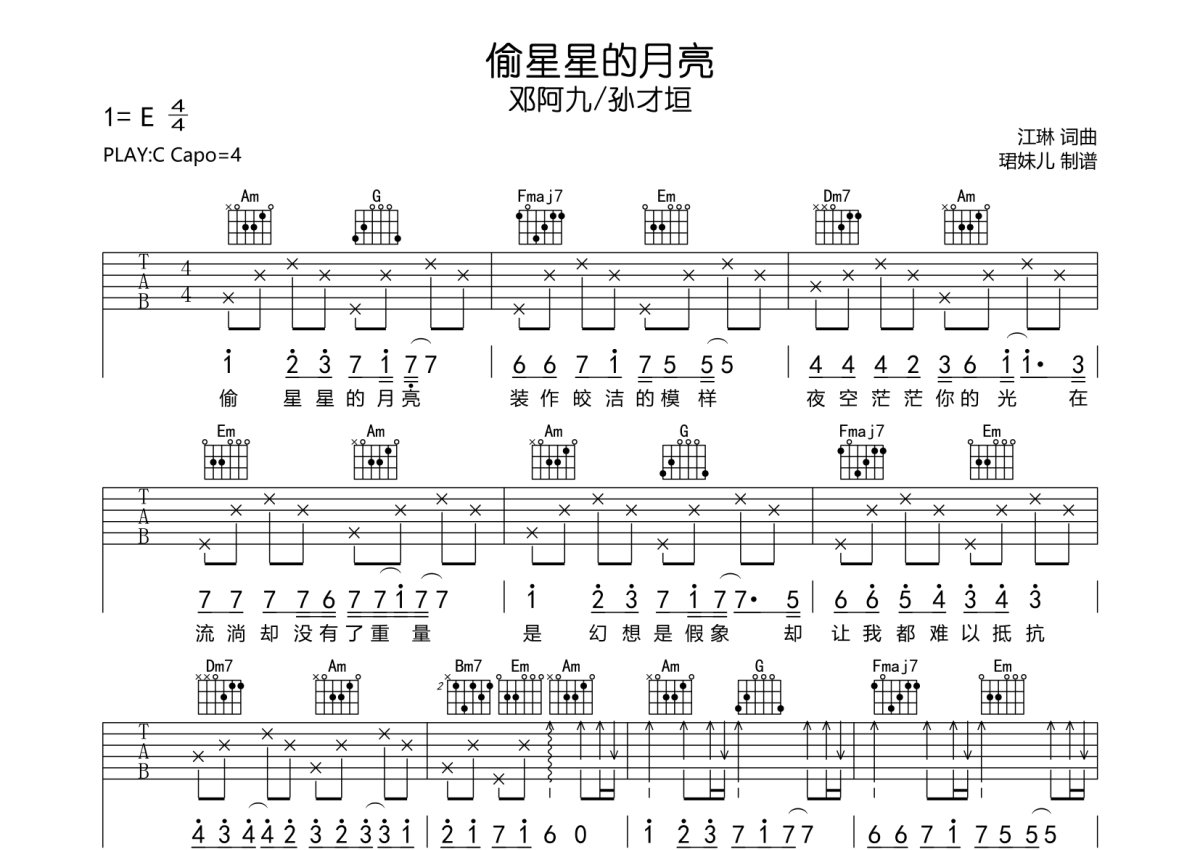 邓阿九/孙才垣《偷星星的月亮》吉他谱 - C调弹唱六线谱