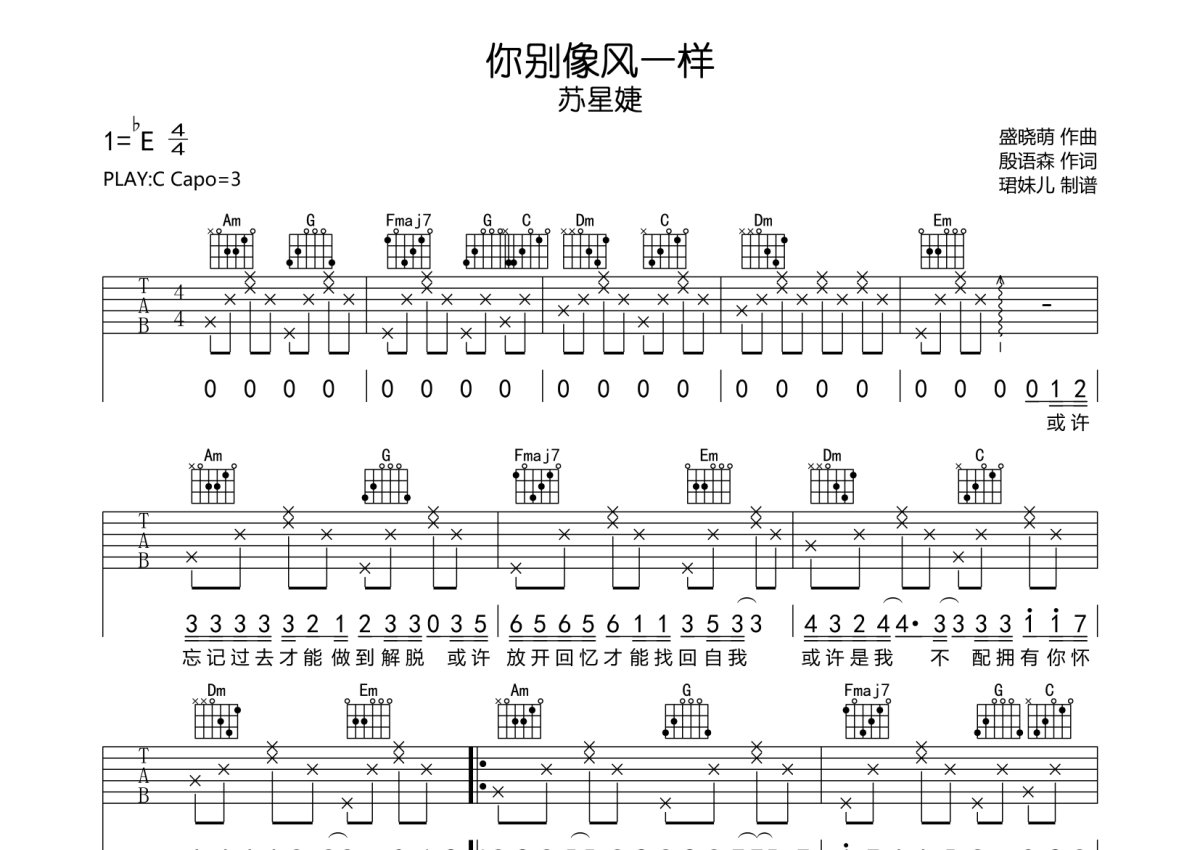苏星婕《你别像风一样》吉他谱 - C调弹唱六线谱