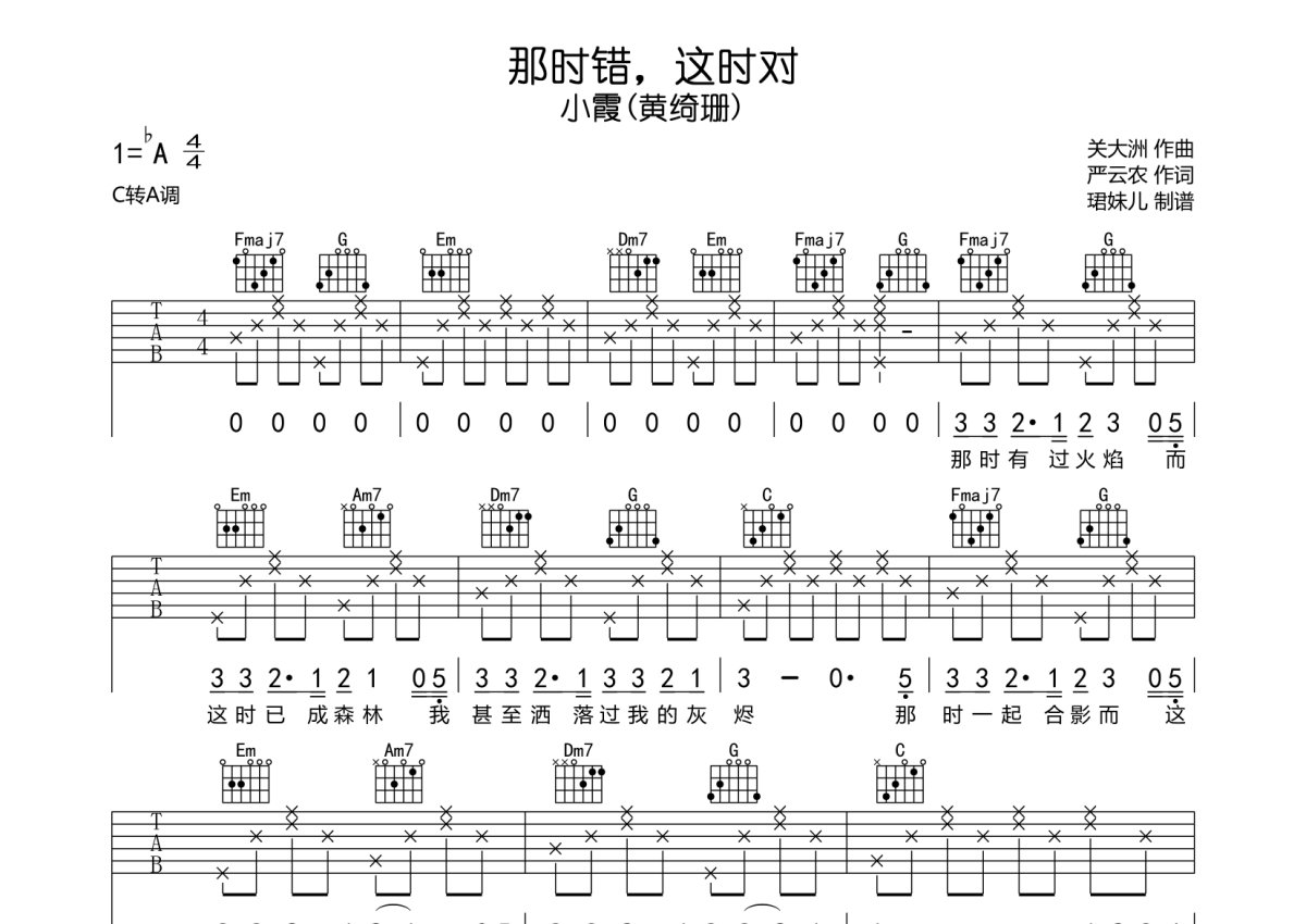 小霞《那时错,这时对》吉他谱 - C调弹唱六线谱