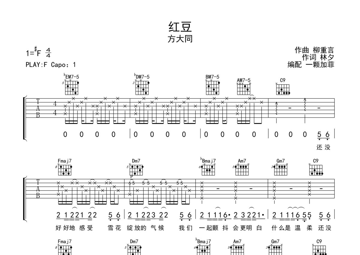 方大同《红豆》吉他谱 - F调弹唱六线谱 - 完整编配版