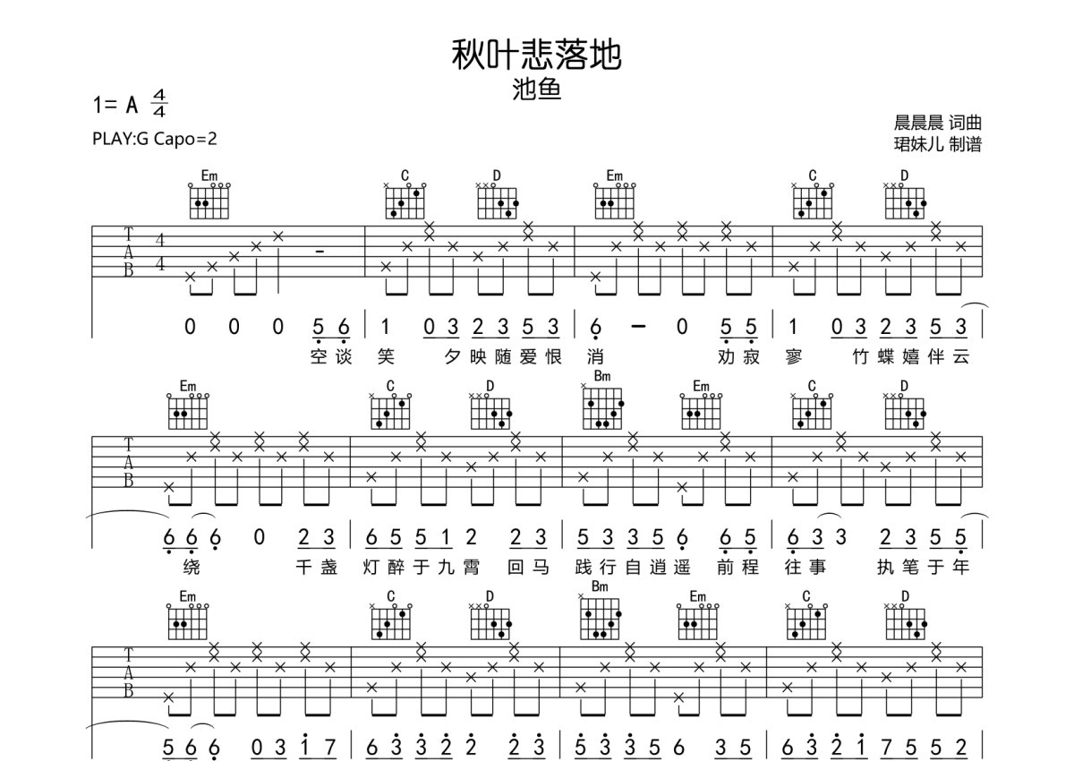 池鱼《秋叶悲落地》吉他谱 - G调弹唱六线谱