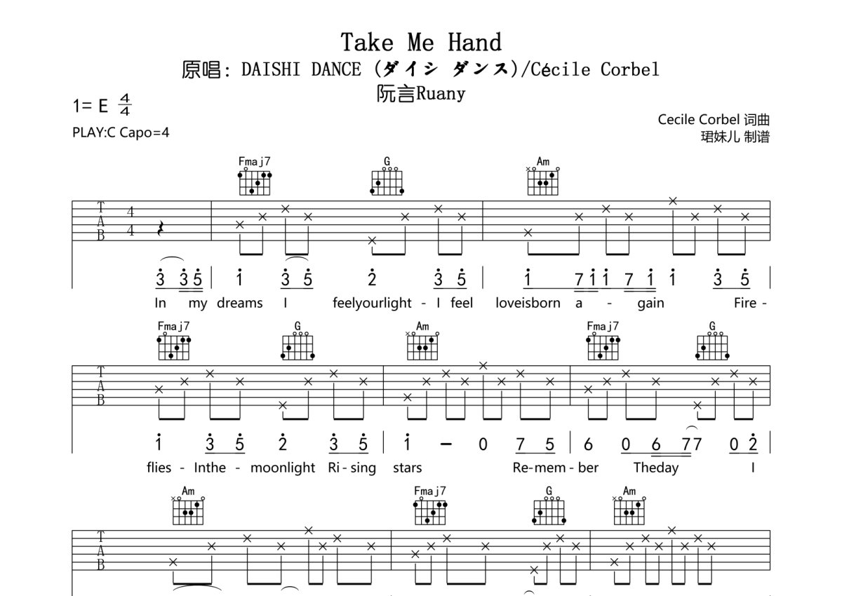 阮言Ruany《Take Me Hand》吉他谱 - C调弹唱六线谱