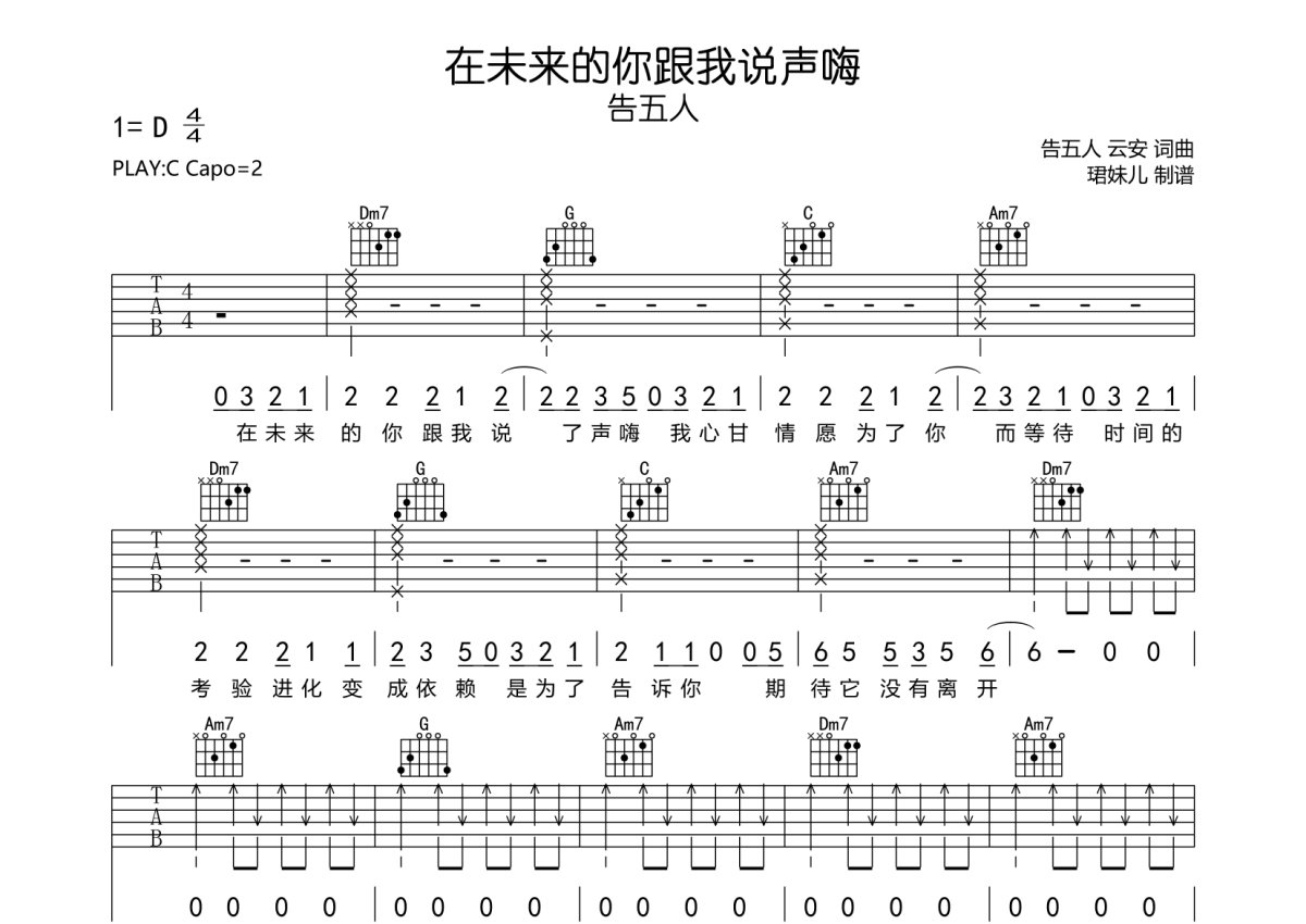 《在未来的你跟我说声嗨》是告五人演唱的一首歌曲,本吉他谱采用的是C调指法编配,这份吉他谱共有三张高清图谱,图谱由 @珺妹儿 编配上传,图谱使用六线谱编配,包含吉他和弦指法、简谱以及歌词部分,使用这份在未来的你跟我说声嗨吉他谱,可以让你更加方便地掌握这首歌曲的弹唱技巧,快来尝试吧。谱采用C调指法编配,弹唱建议变调夹2品,速度85BPM难度较简单,易上手。