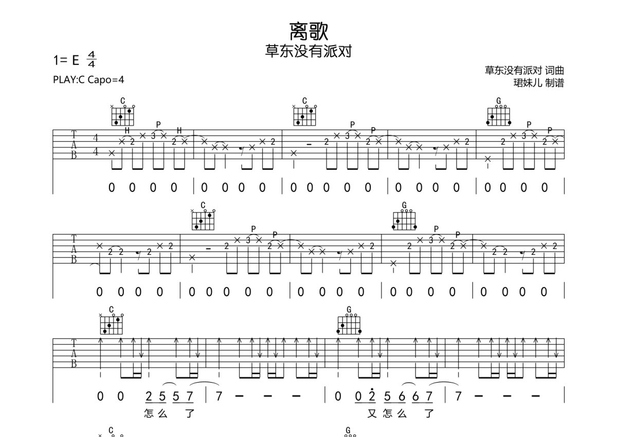 草东没有派对《离歌》吉他谱 - C调弹唱六线谱