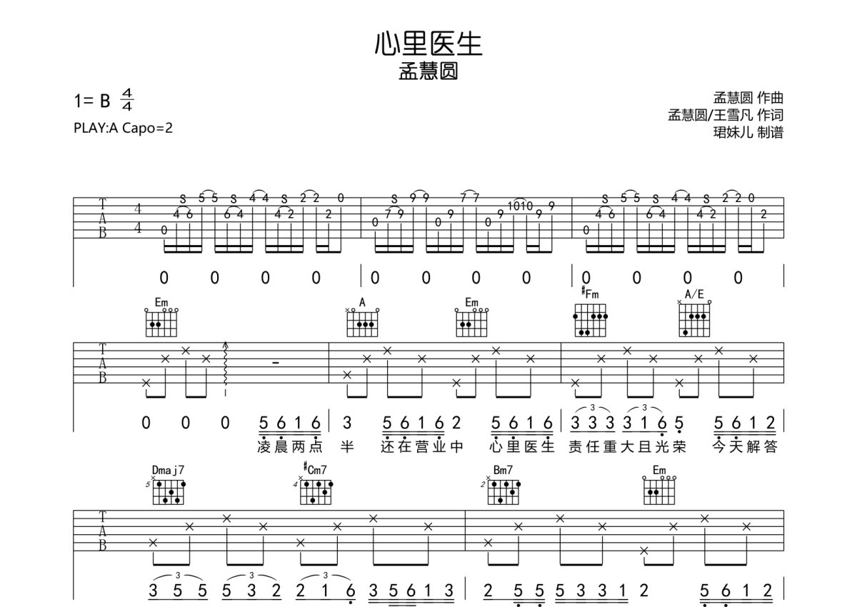 《心里医生》是孟慧圆演唱的一首歌曲,本吉他谱采用的是A调指法编配,这份吉他谱共有两张高清图谱,图谱由 @珺妹儿 编配上传,图谱使用六线谱编配,包含吉他和弦指法、简谱以及歌词部分,使用这份心里医生吉他谱,可以让你更加方便地掌握这首歌曲的弹唱技巧,快来尝试吧。谱采用A调指法编配,弹唱建议变调夹2品,速度85BPM难度较简单,易上手。