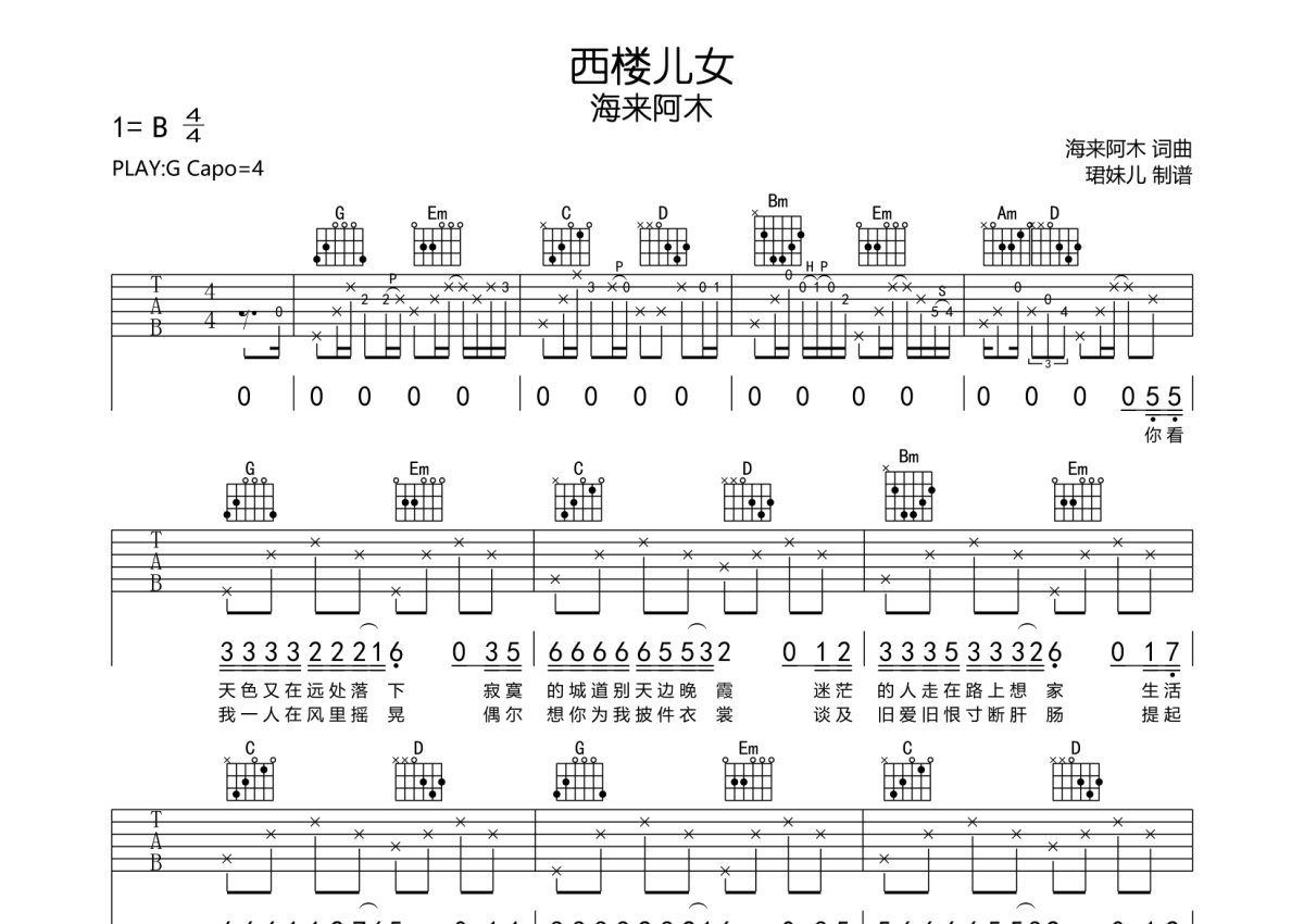 海来阿木《西楼儿女》吉他谱 - G调弹唱六线谱