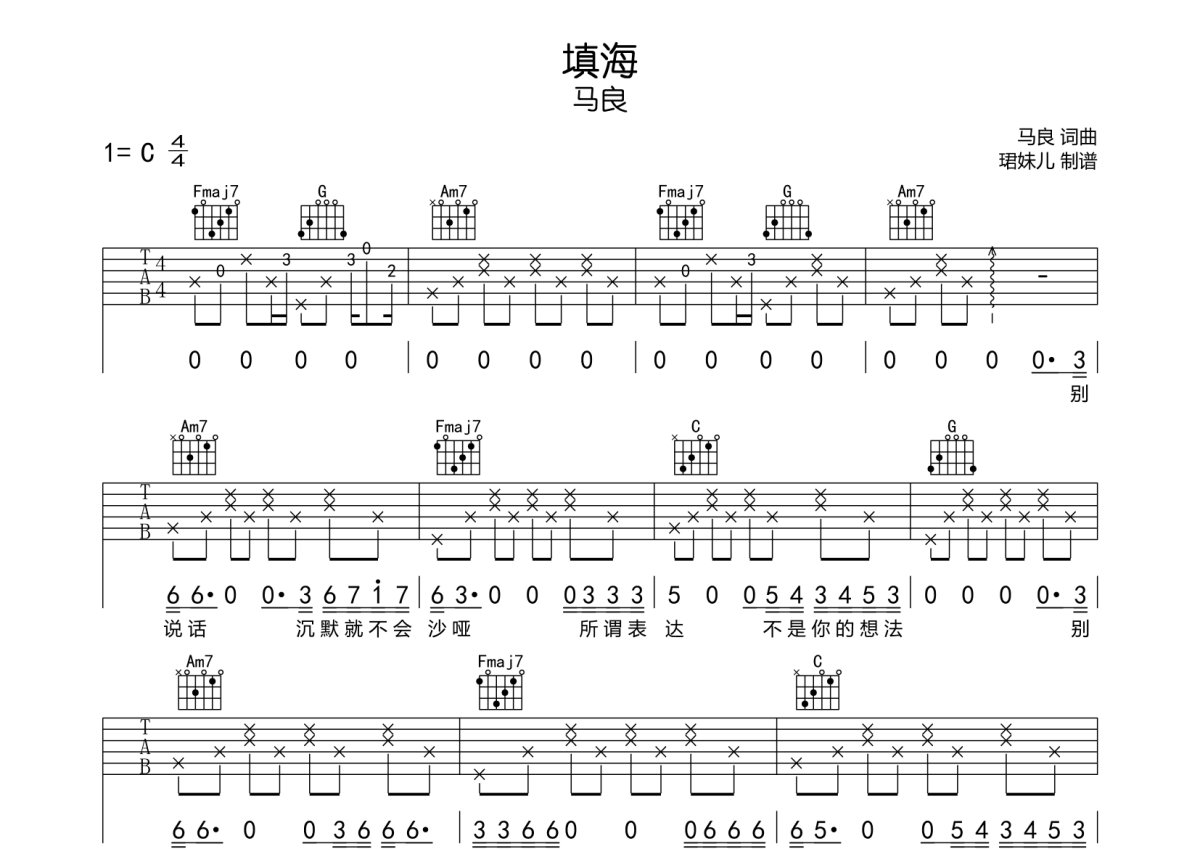 马良《填海》吉他谱 - C调弹唱六线谱