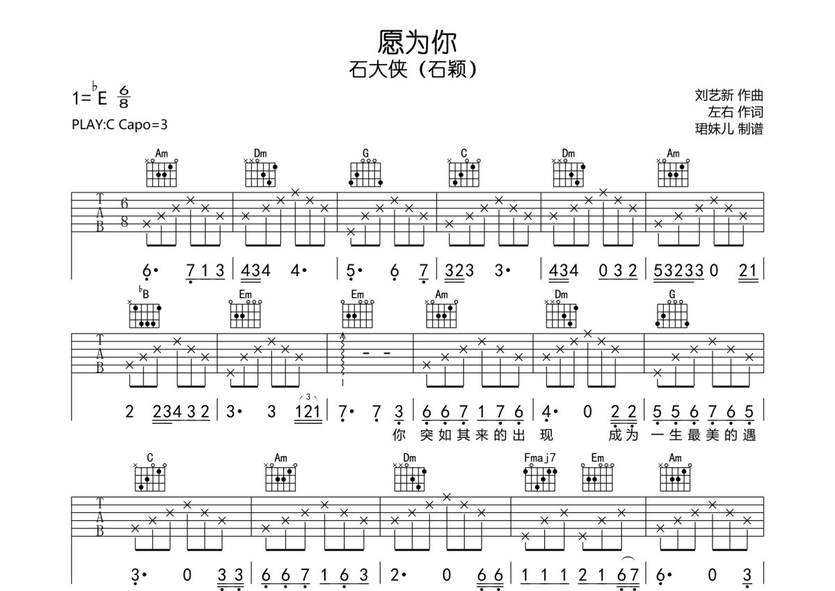 石大侠(石颖)《愿为你》吉他谱 - C调弹唱六线谱