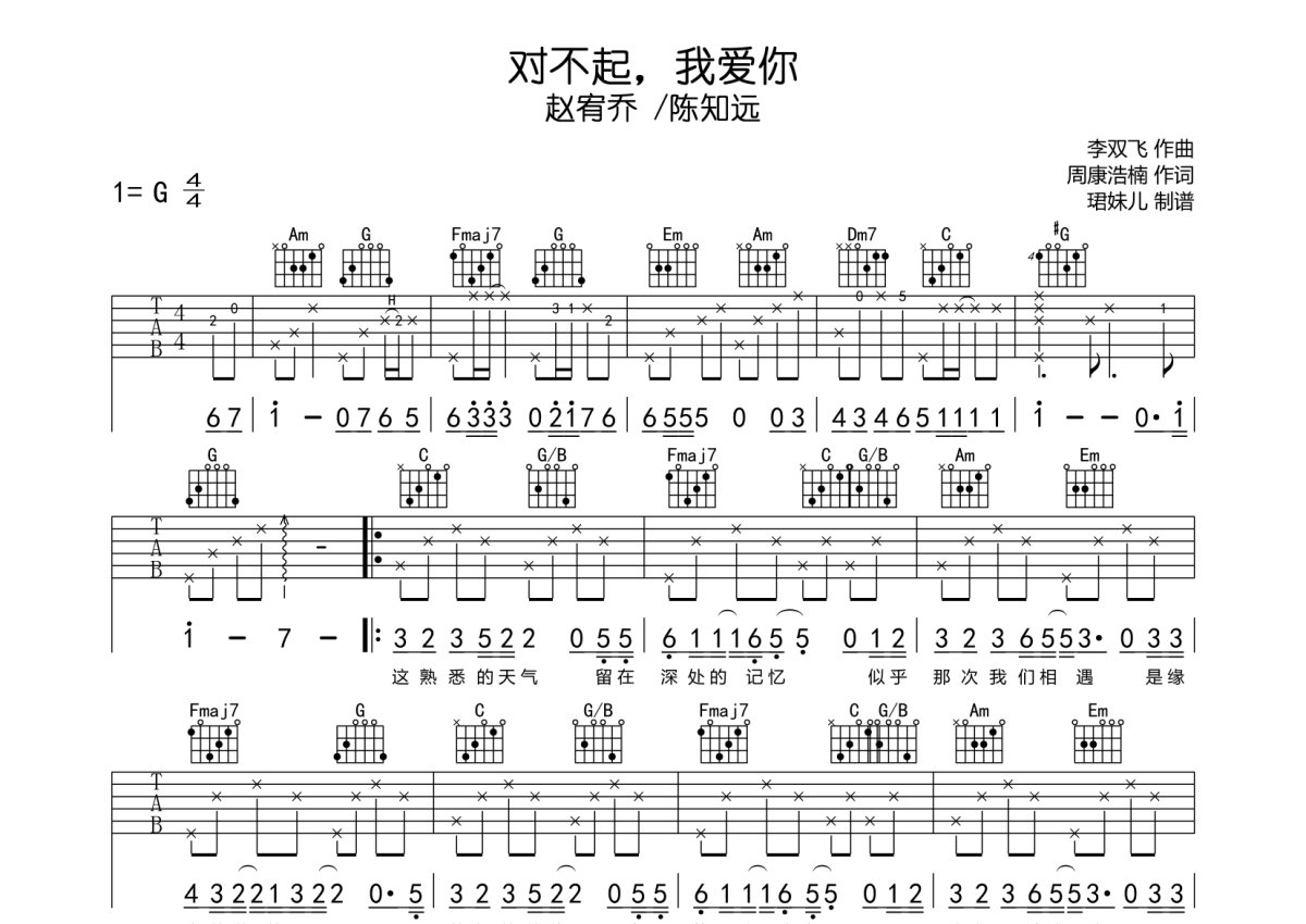 《对不起,我爱你(Live)》是赵宥乔演唱的一首歌曲,本吉他谱采用的是G调指法编配,这份吉他谱共有三张高清图谱,图谱由 @珺妹儿 编配上传,图谱使用六线谱编配,包含吉他和弦指法、简谱以及歌词部分,使用这份对不起,我爱你(Live)吉他谱,可以让你更加方便地掌握这首歌曲的弹唱技巧,快来尝试吧。谱采用G调指法编配,速度85BPM难度较简单,易上手。